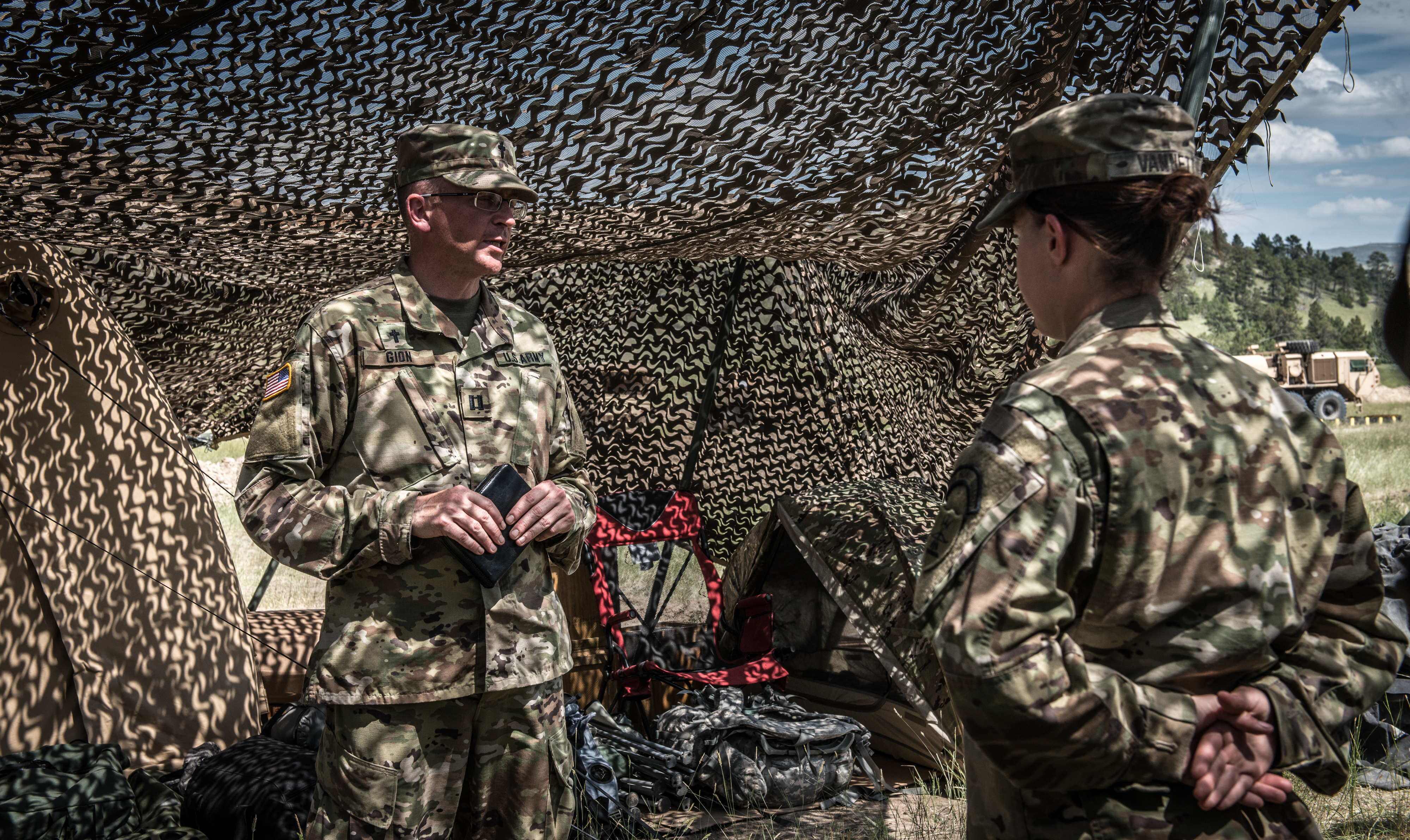 Chaplain (Cpt.) Chad Gion, 164th Engineer Battalion chaplain, provides religious support for members of the 957th Engineer Company on July 26 during their annual training at Camp Guernsey.
