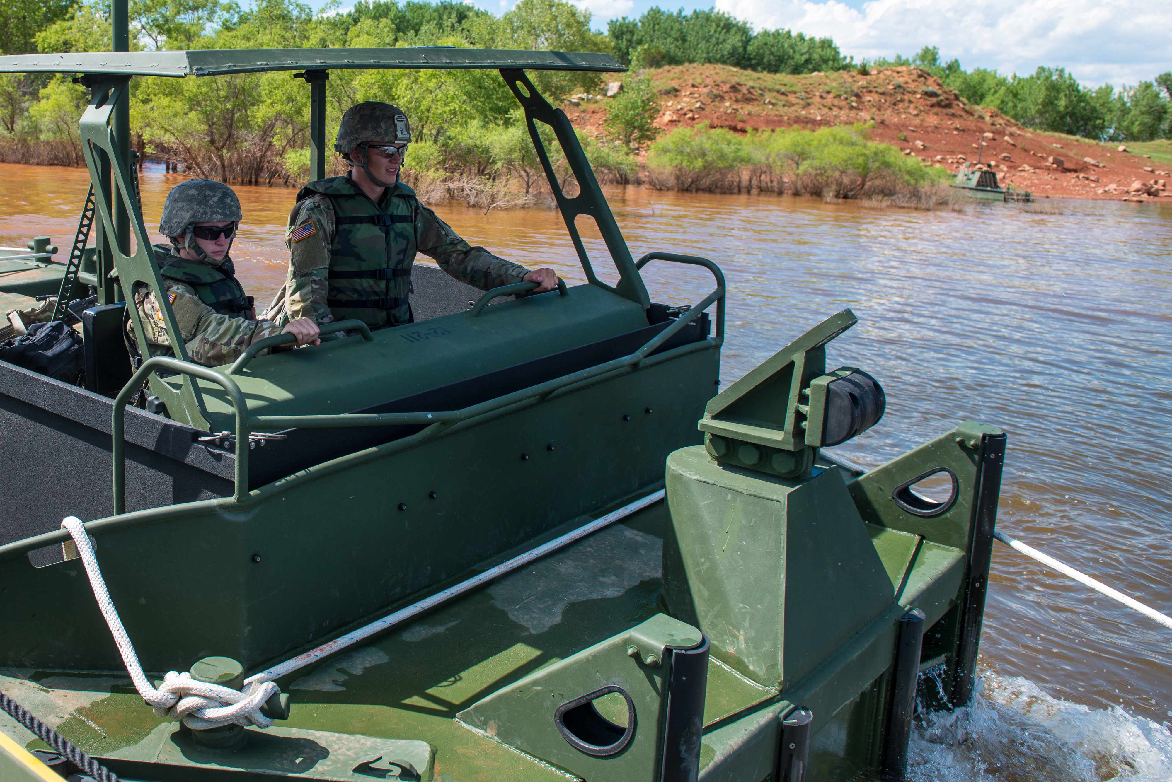 Spc. Aaron Haberlock, 957th Engineer Company, guides vehicles onto a raft to ferry them across the Glendo Reservoir on July 25 during their annual training at Camp Guernsey.