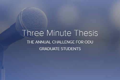 The 3 Minute Thesis (3MT) is a university-wide competition for research-based master’s thesis and doctoral students at Old Dominion University. Competitors have one still slide and three minutes to explain the scope and significance of their research to a general audience.