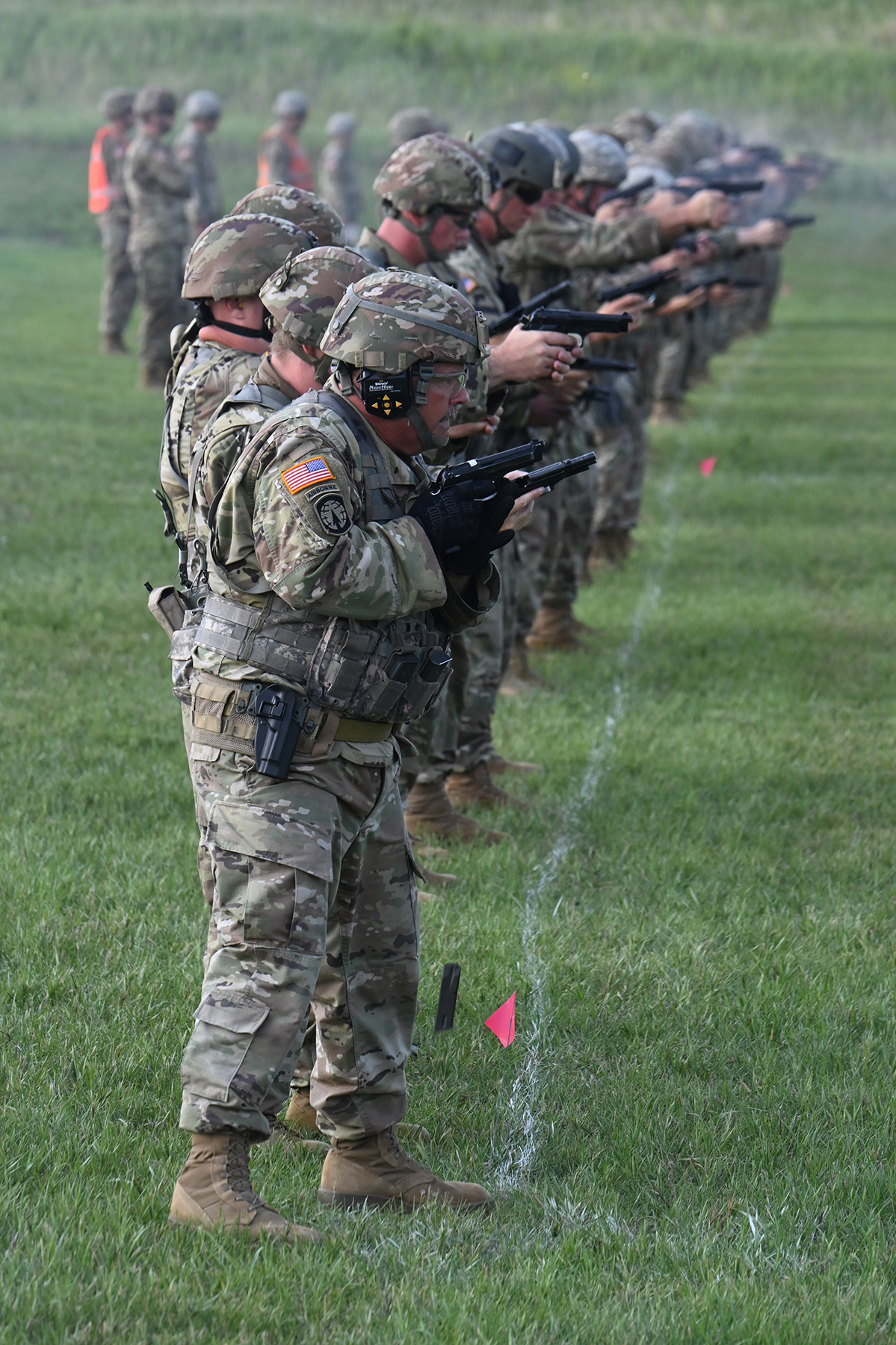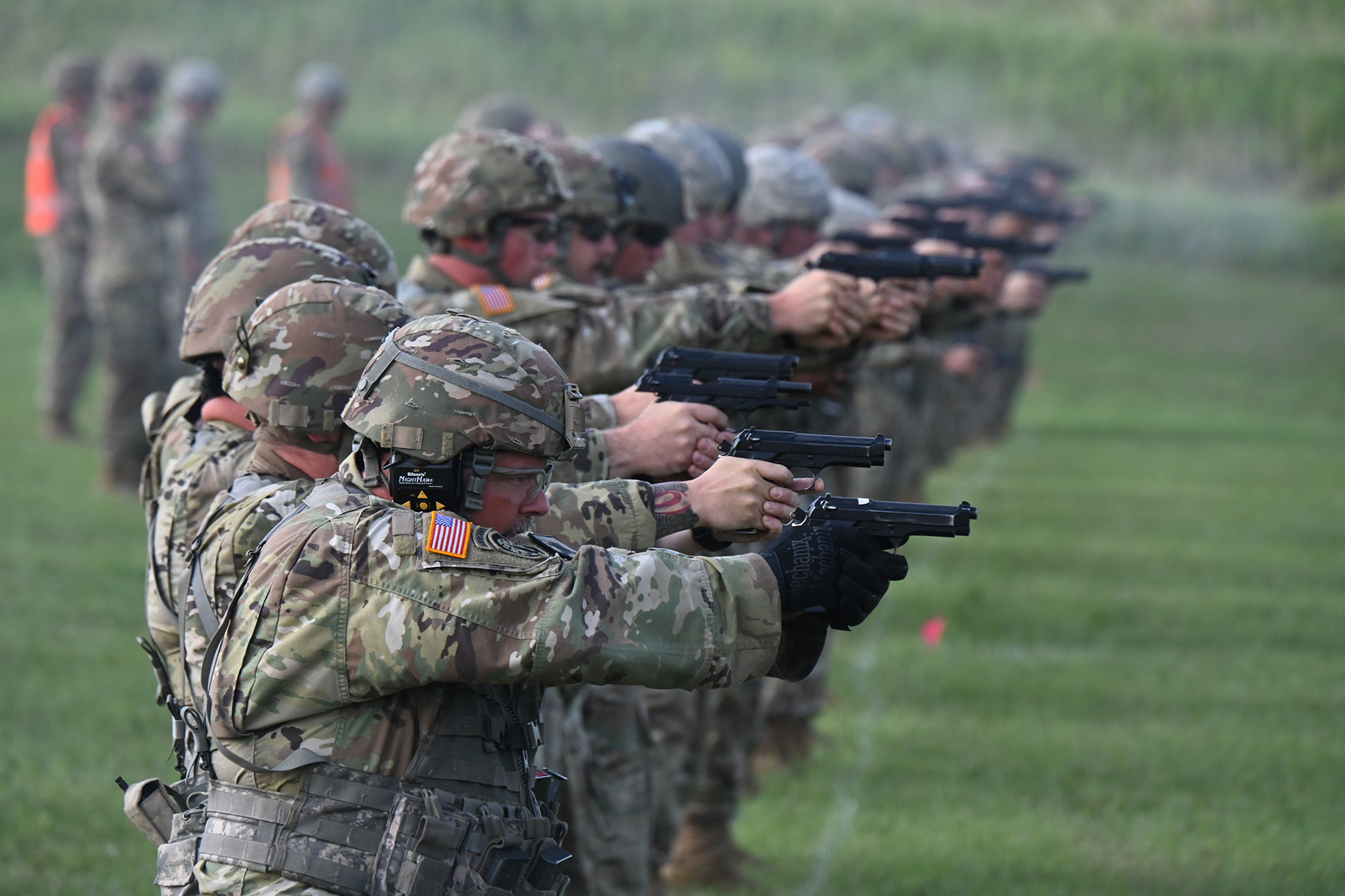 Photo: Colonel Benjamin Cleghorn, commander of the 141st Maneuver Enhancement Brigade, fires his M9 pistol during the General George S. Patton Match portion of the N.D. National Guard 2021 Adjutant General’s Combat Marksmanship Match at the Camp Grafton Training Center South firing complex, near McHenry, North Dakota, July 11, 2021. (National Guard photo by Chief Master Sgt. David H. Lipp, 119th Wing)