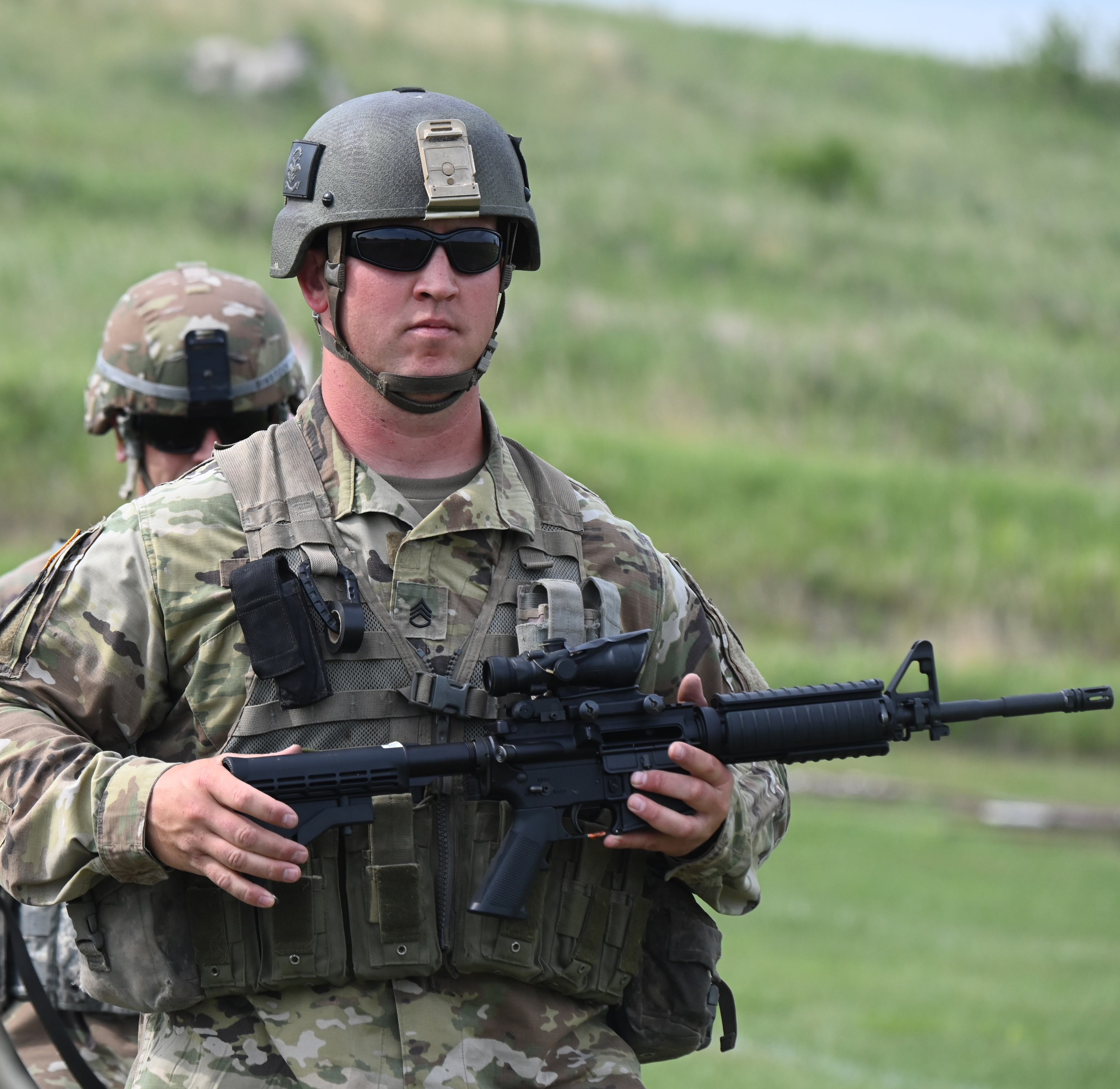 Staff Sgt. Evan Messer, of the 815th Engineer Construction Company, was the top open class individual shooter, and Pfc. Christopher Sagers, of the 816th Military Police Company, was the top novice class individual shooter. 76 Soldiers and Airmen participated on 18 teams, with 39 novice shooters. The match included ten scored M9 pistol and M4 rifle events.