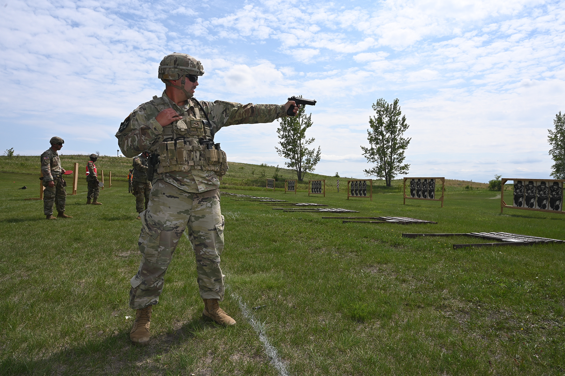 Sergeant Andrew Maley, 817th Engineer Company (SAPPER), aims an M9 pistol as he prepares to fire at a target at the N.D. National Guard 2021 Adjutant General’s Combat Marksmanship Match at the Camp Grafton Training Center firing complex, near McHenry, North Dakota, July 9, 2021. Maley is one of five current shooters from the state that have earned the distinguished marksmanship badge in both rifle and pistol.