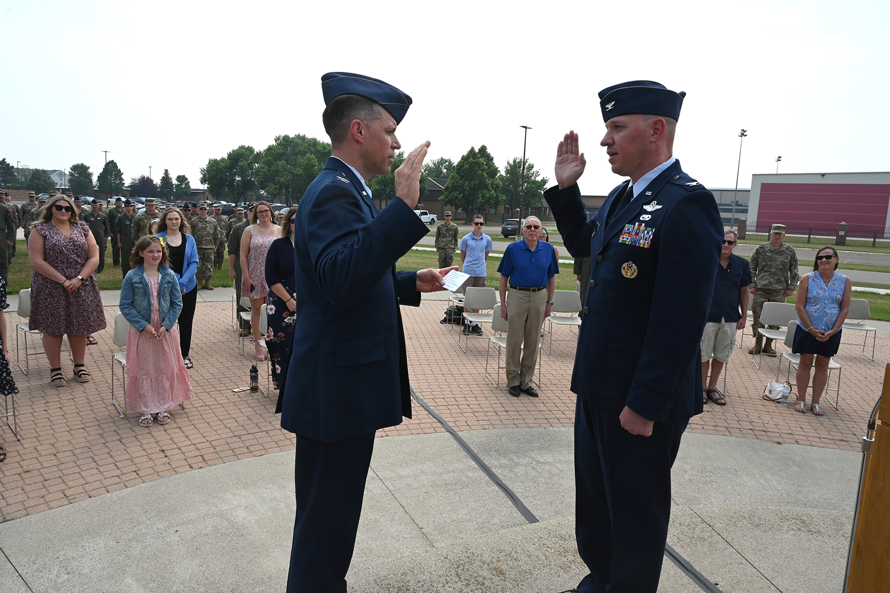 Colonel Mitch Johnson, 119th Wing commander, administered the reaffirmation of the oath of office to Col. Chris Domitrovich, 119th Wing vice commander. (National Guard story and photos by Chief Master Sgt. David Lipp, 119th Wing)