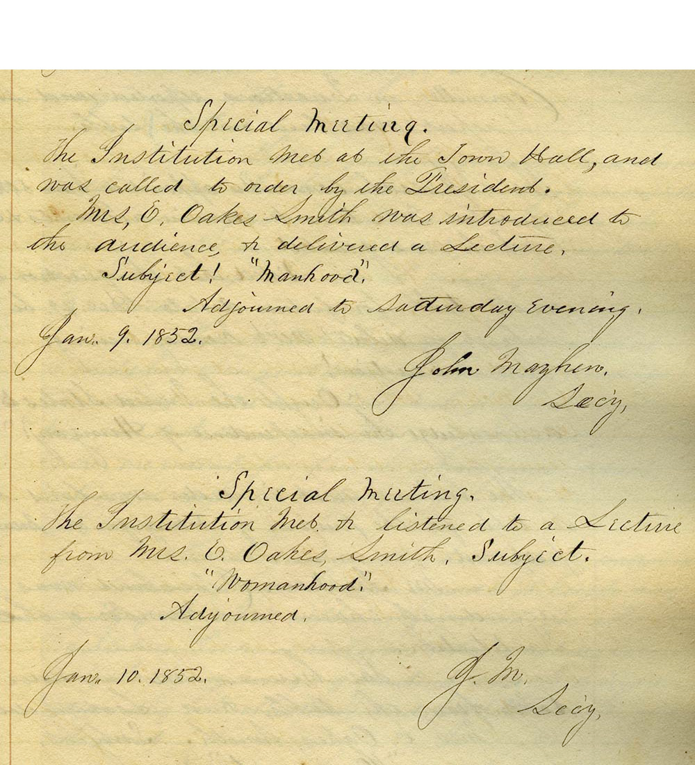 Only one woman was ever asked to address the men of the Edgartown Lyceum. In 1852, Mrs. Elizabeth Oakes Smith (1806-1893) gave a four-part lecture series on the topics of “Manhood,” “Womanhood,” “Humanity,” and “Dress and Beauty.”