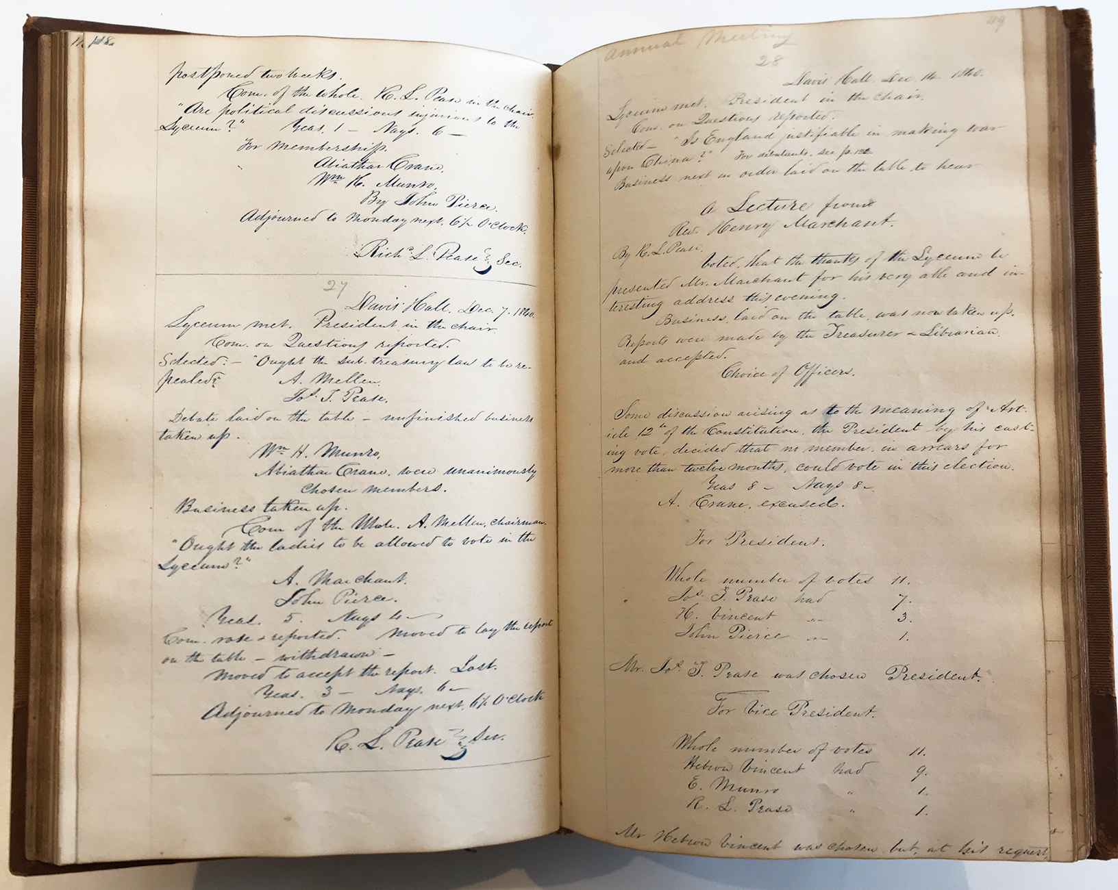 In 1837, David Davis (1802-1668) founded the Edgartown Lyceum. Over the next 16 years, the group hosted over 75 lectures and 120 debates, five of which related to women and their role in society. While questions about whether the “fair sex” should be held in highest estimation or if they should receive an “intellectual education” elicited favorable responses, more radical questions, like the sexes being placed “on an equality in respect to rights and duties” were met with resounding nos. For a moment the group considered allowing “the Ladies” to join the Lyceum, but after an initial favorable vote, they changed their mind (see image behind). Instead, women were permitted to attend meetings and have the “privilege of the Library,” but not participate in any of the discussions.