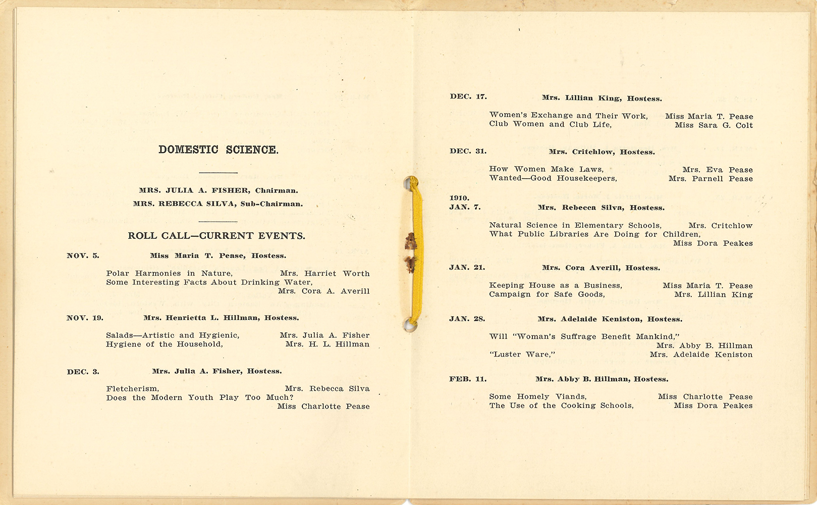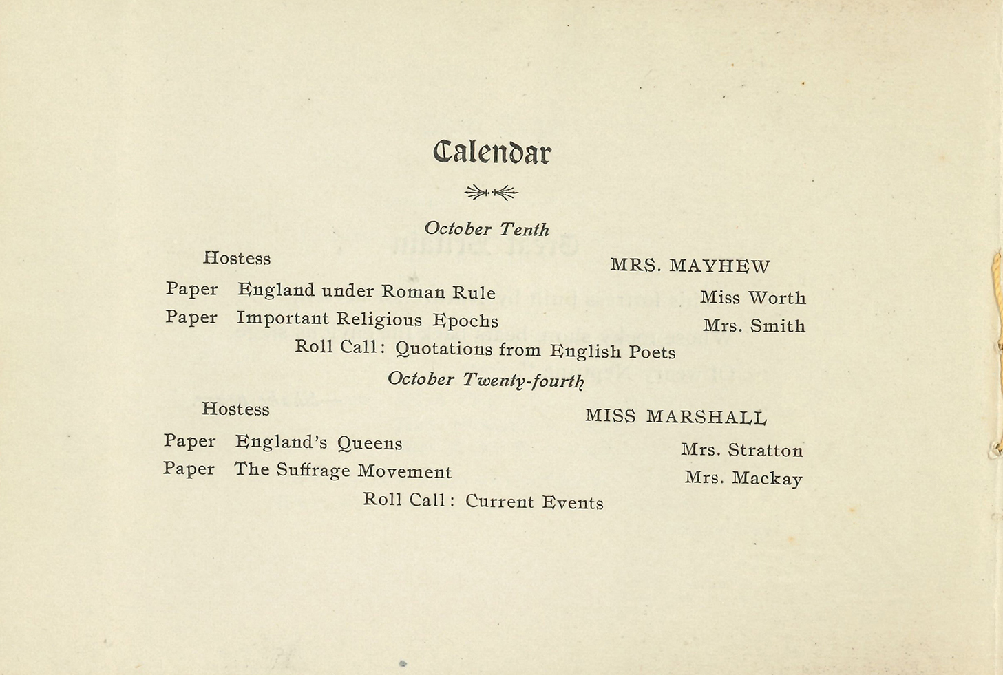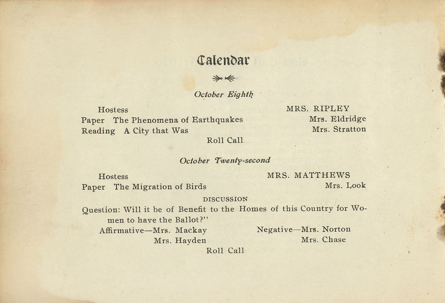 The Want to Know Club, the first to be formed, was founded by “a few energetic women who united to form an association to promote the social pleasure, intellectual growth and moral development of its members.” Within a few years of its founding in 1893, its members held a debate on women’s suffrage, after which twelve women came out in favor of municipal suffrage, four against, and two undecided. The other women's clubs on the Island similarly addressed the issue, with Mrs. Marshall giving an account of the suffrage movement to members of the Triad Club in 1909 and Mrs. Abby Hillman presenting on the question “Will Women’s Suffrage Benefit Mankind” to members of the Edgartown Women’s Club in the same year.