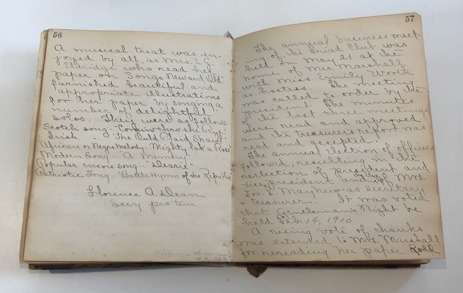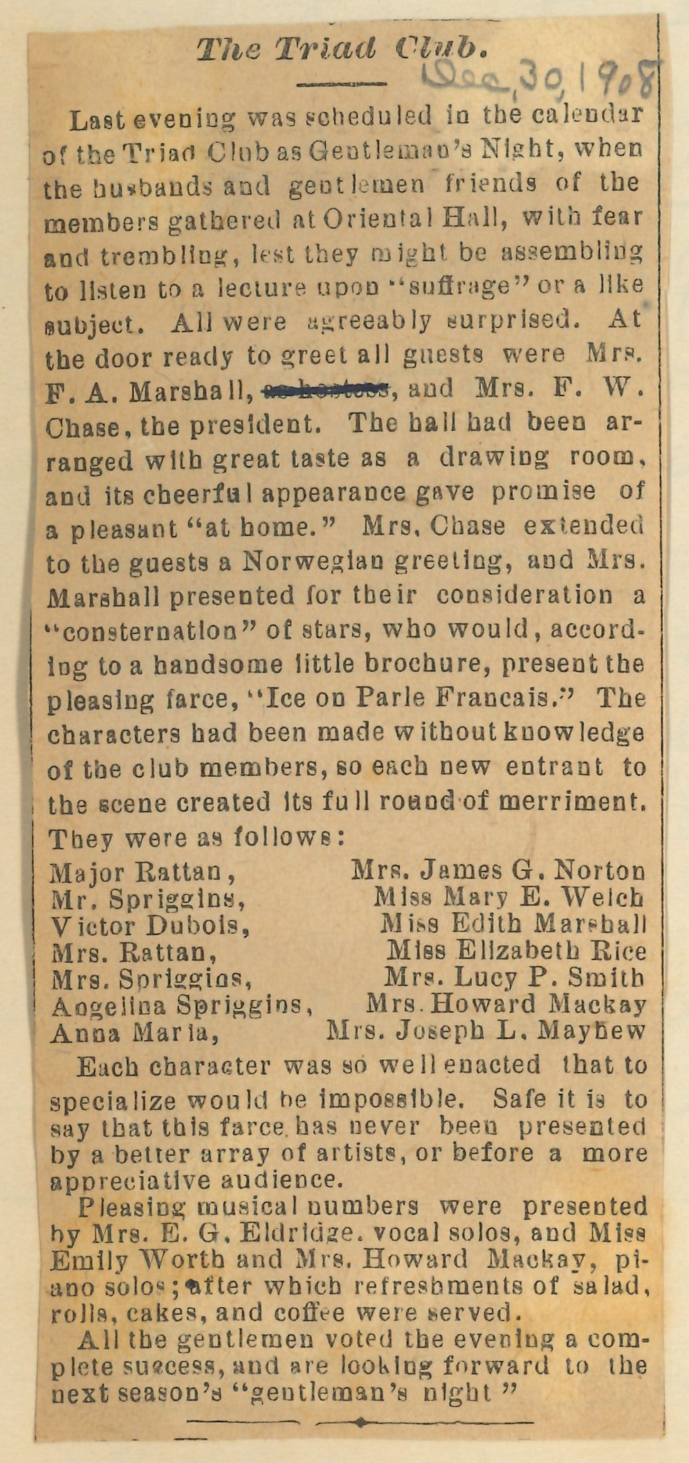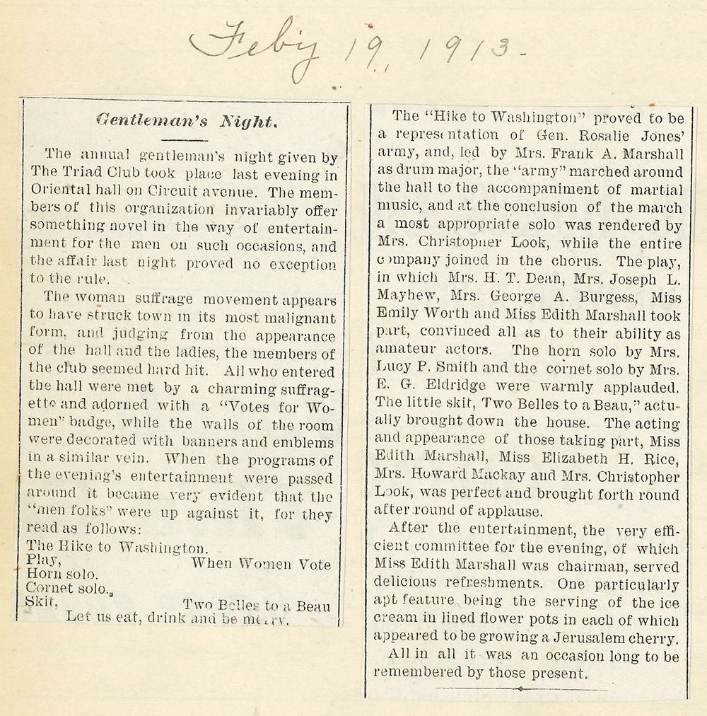 According to local newspaper coverage from the time, when the Triad Club held their first Gentleman’s Night in December of 1908, the men attended with “fear and trembling, lest they might be assembling to listen to a lecture upon ‘suffrage’ or a like subject,” but all were “agreeably surprised” to instead enjoy a “pleasing farce” and musical numbers. Four short years later though, Gentleman’s Night was just what they had feared — the halls were decked with suffrage banners, “Votes for Women” badges were handed out at the entrance, and the night’s entertainment began with “The Hike to Washington” and continued with a short play, “When Women Vote” (see articles above).