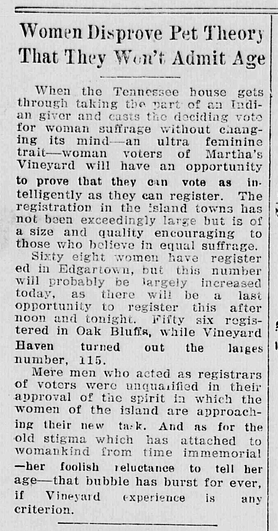 Two months earlier, the Vineyard Gazette reported, not without some condescension, that 68 women from Edgartown, 56 from Oak Bluffs, and 115 from Vineyard Haven had already registered to vote.“Mere men who acted as registrars of voters were unqualified in their approval of the spirit in which the women of the Island are approaching their new task. And as for the old stigma which has attached to womankind from time immemorial – her foolish reluctance to tell her age – that bubble has burst for ever, if Vineyard experience is any criterion.”