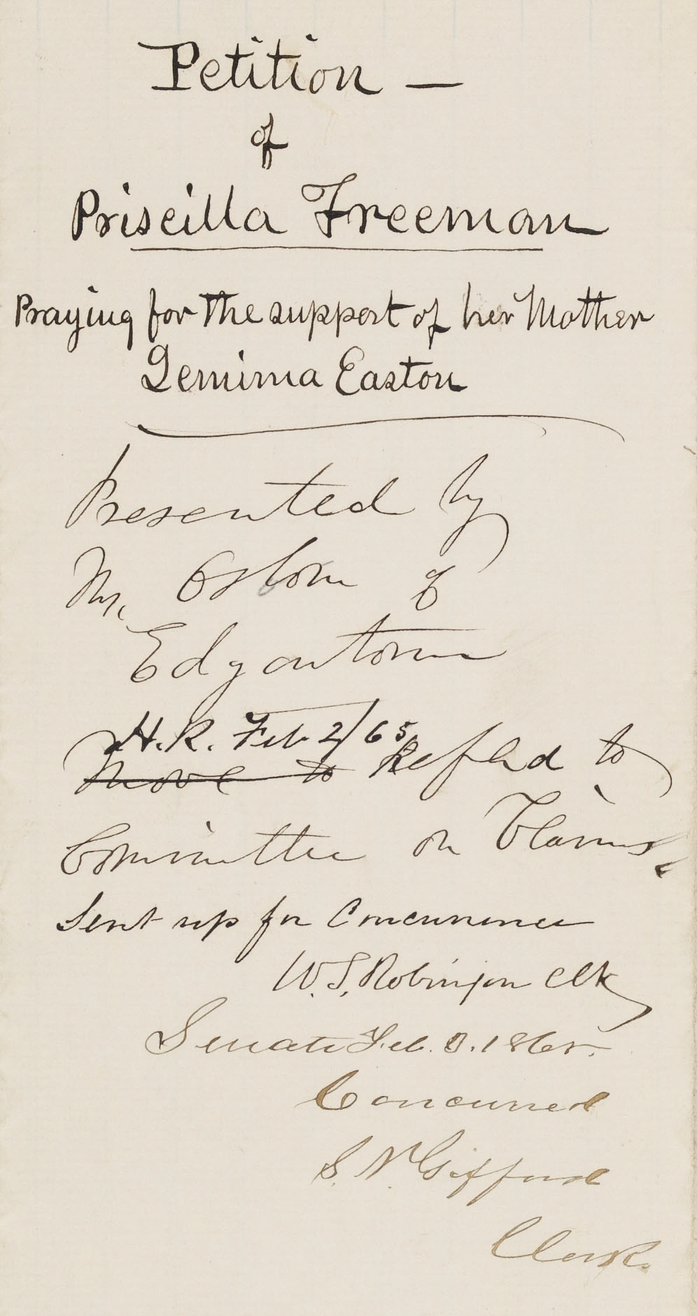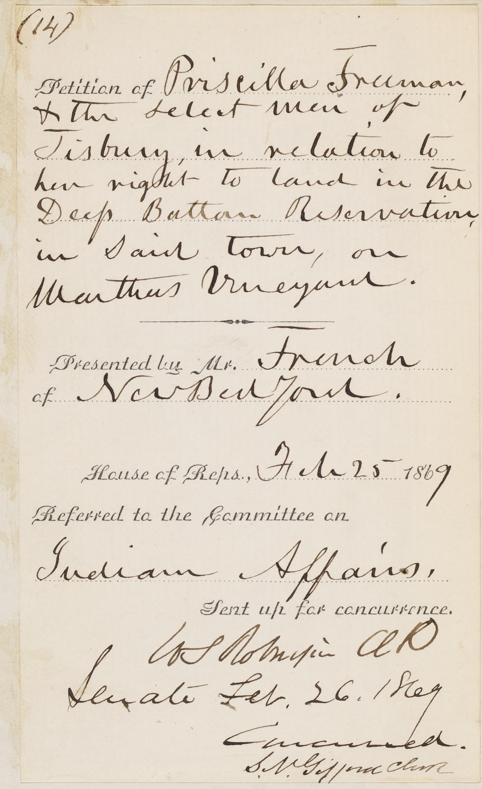 One such woman was Priscilla Freeman, (1812-1888), who in March of 1869 sent a petition to the state of Massachusetts as “the only living female inhabitant on the Deep Bottom Reservation” for the enfranchisement of native people and the right for women to vote. Priscilla was tenacious, and while this petition went unheard, she continued to fight for equal access. Over the years she submitted numerous petitions about land rights, fishing rights, and asking for help supporting her mother, Jemima Easton (see images above). In 1874 she even appeared before members of the Massachusetts Legislature to plead for the restoration of her fishing rights in Tisbury Great Pond.