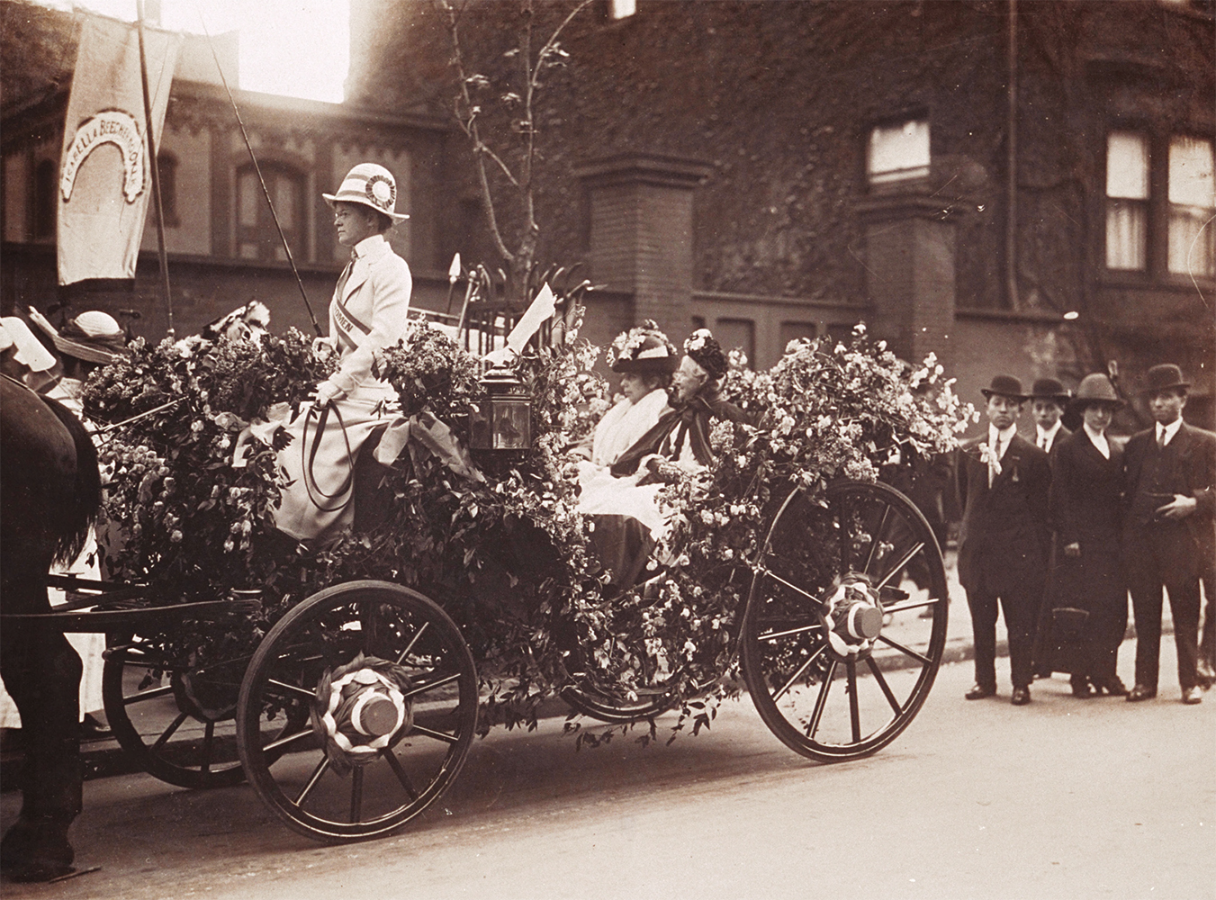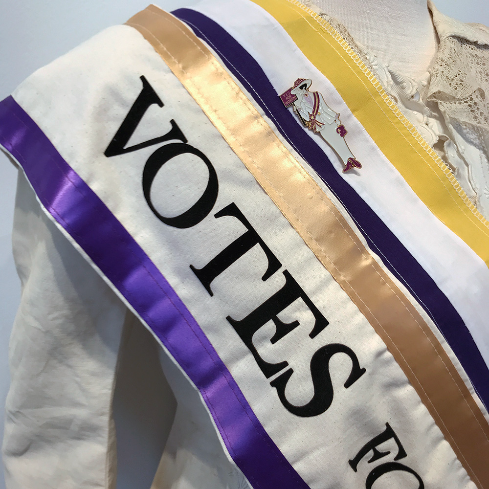 Anti-suffrage propaganda often portrayed women involved in the movement as masculine, so suffragists instead conformed to feminine norms of the day, donning white dresses and accessorizing with sashes, pins, and jewelry that reflected the colors and symbols of the movement. At marches and rallies, the result of this fashion choice was visually striking and gave the appearance of a harmonious, united front.