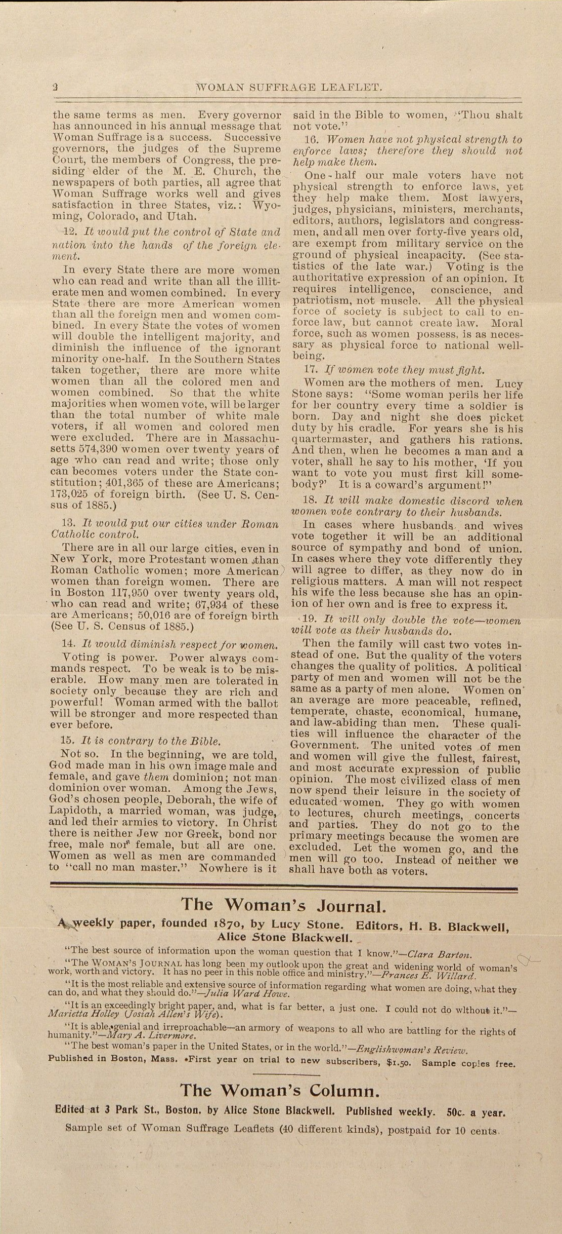 Highly progressive for his time, many of Blackwell’s arguments for the respectability of women and their qualification to participate in political life ring true today. However, others feel dated, including his emphasis on how specifically the “refined, temperate, [and] chaste” nature of women would shape government. In responding to the argument that women were already represented in government he argued that, “Men cannot represent women, because they are unlike women. Women as a class have tastes, interests and occupations which they alone can adequately represent. Men specially represent material interests; women will specially represent the interests of the home.”