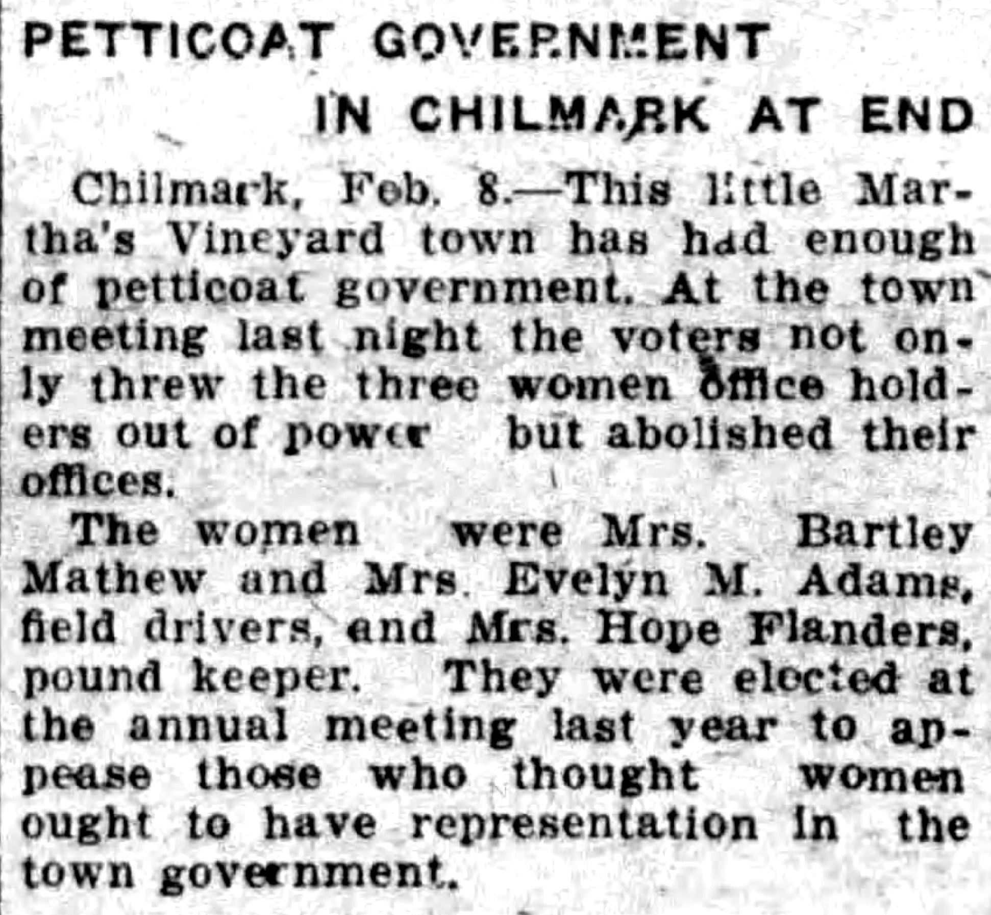 It would take many more years for Islanders to adjust to women’s involvement in civic and political life. There was more than one false start. In 1923, only a year after voters in Chilmark elected three women to town offices, the Up Islanders did a one-eighty, not only removing the women from their positions, but altogether eliminating the offices they had held!