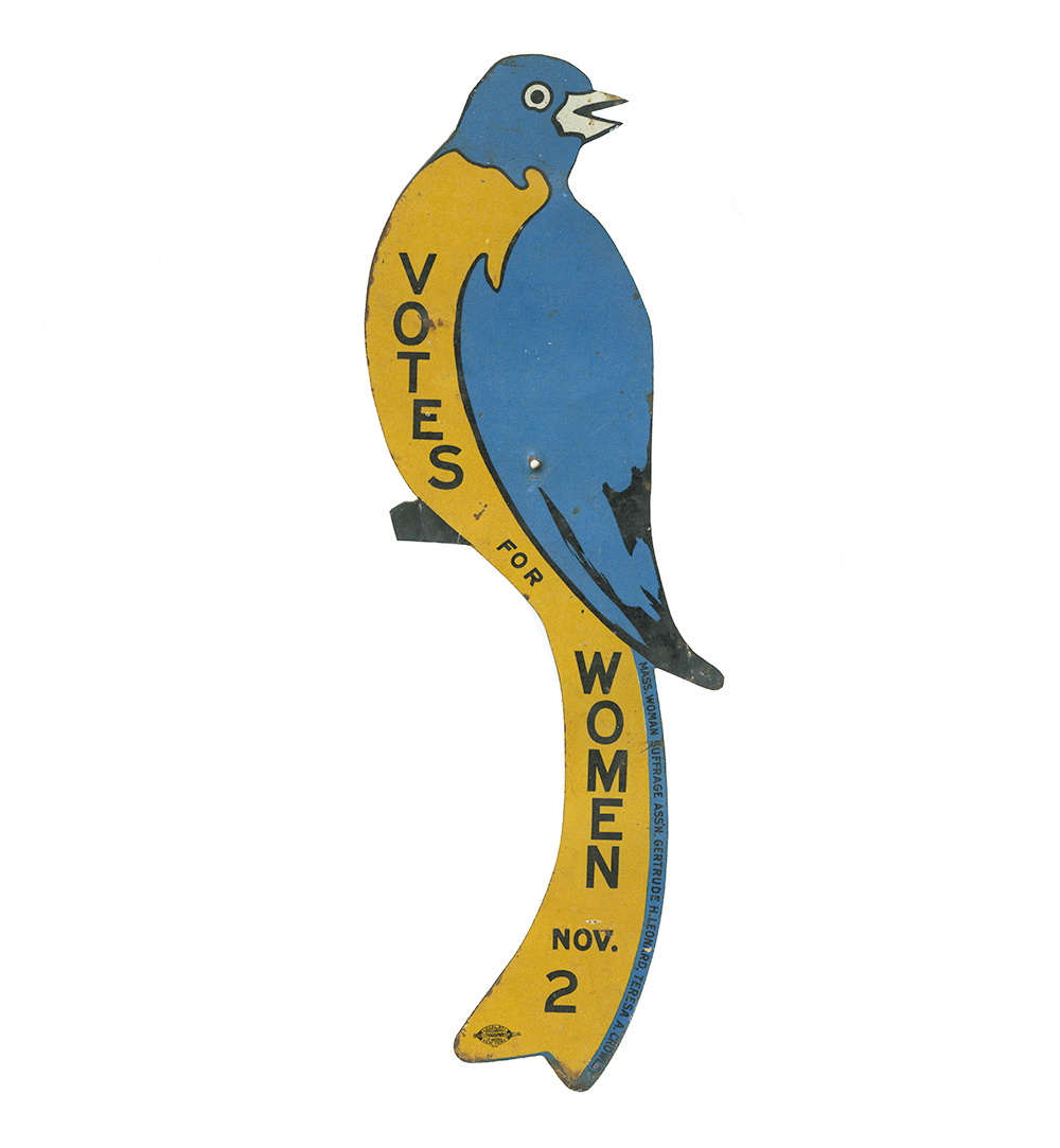 When suffragists in Massachusetts organized in support of the state’s 1915 referendum on women’s suffrage they deployed a little blue bird. On July 15, “Suffrage Blue Bird Day,” they plastered the state with roughly 100,000 colorful bluebird pins, like the one shown here, calling for the men of the state to cast their ballot in favor of women’s right to vote.