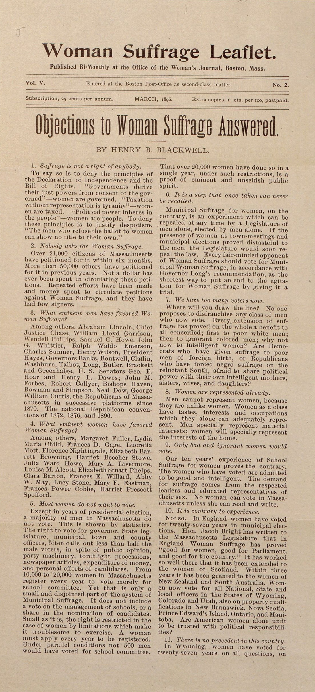 Shortly after the failed 1895 Massachusetts referendum, Henry Blackwell, a longtime Vineyard summer resident and a strong supporter of the suffrage movement, attempted to rebut some of the anti-suffragists’ arguments.