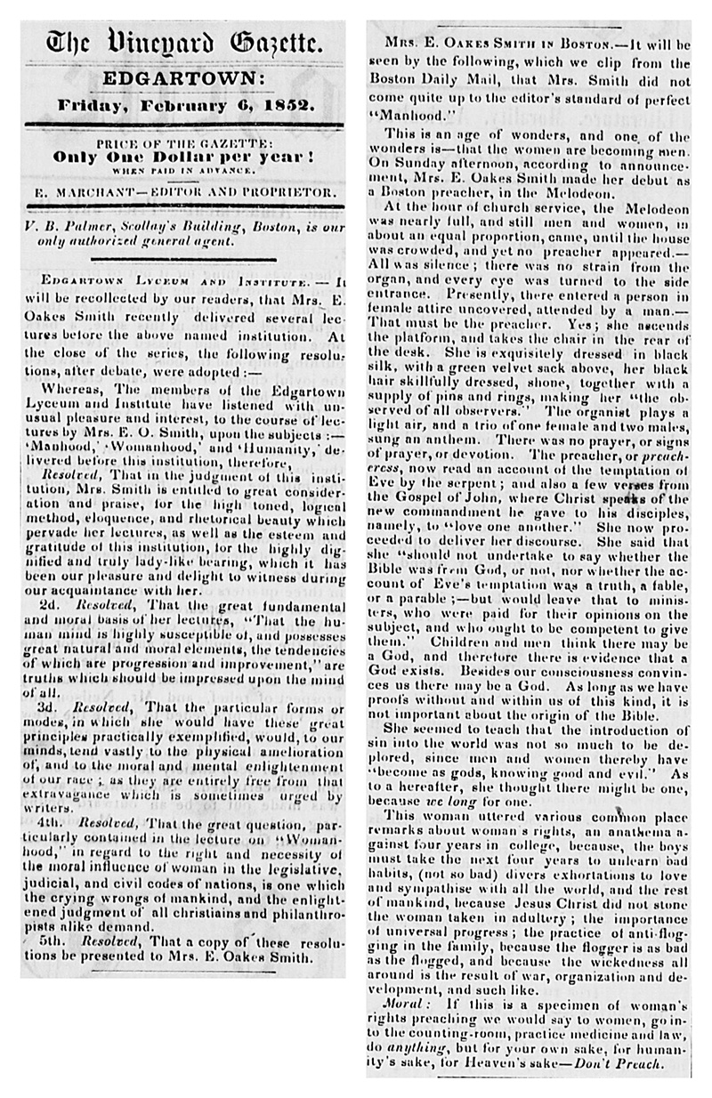 The men of the Edgartown Lyceum responded favorably, declaring it a “pleasure and delight” to hear Mrs. Smith speak. They praised the “high toned, logical method, eloquence, and rhetorical beauty” of her lectures and the “highly dignified and truly lady-like bearing” of her presentation. In a set of resolutions the group passed following Smith’s lectures, they noted her “Womanhood” lecture in particular and stated their support of the “right and necessity of the moral influence of woman in the legislative, judicial, and civil codes of nations.”