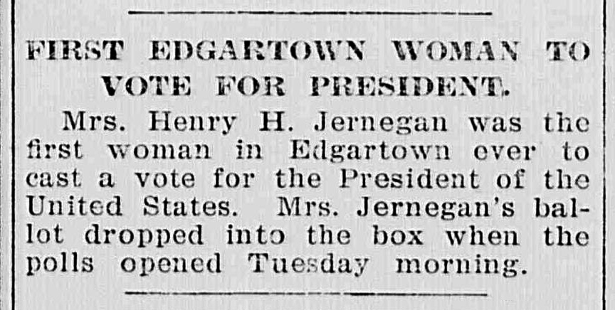 On November 4th, 1920, 49-year-old Almah Pease Jernegan became the first Edgartown woman to ever cast a ballot in a presidential race, this one between Republican senator Warren G. Harding and Ohio governor David Cox.