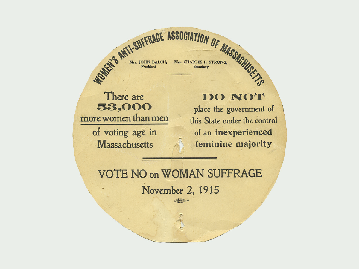 Massachusetts was home to some of the leaders of the women’s suffrage movement, but it was also home to one of the nation’s strongest anti-suffrage groups, the Massachusetts Association Opposed to the Further Extension of Suffrage to Women (later the Women’s Anti-Suffrage Association of Massachusetts). One of the main fears of anti-suffrage campaigners was that if women participated in civic life it would break up the family — women would no longer “properly care” for their husband and children.