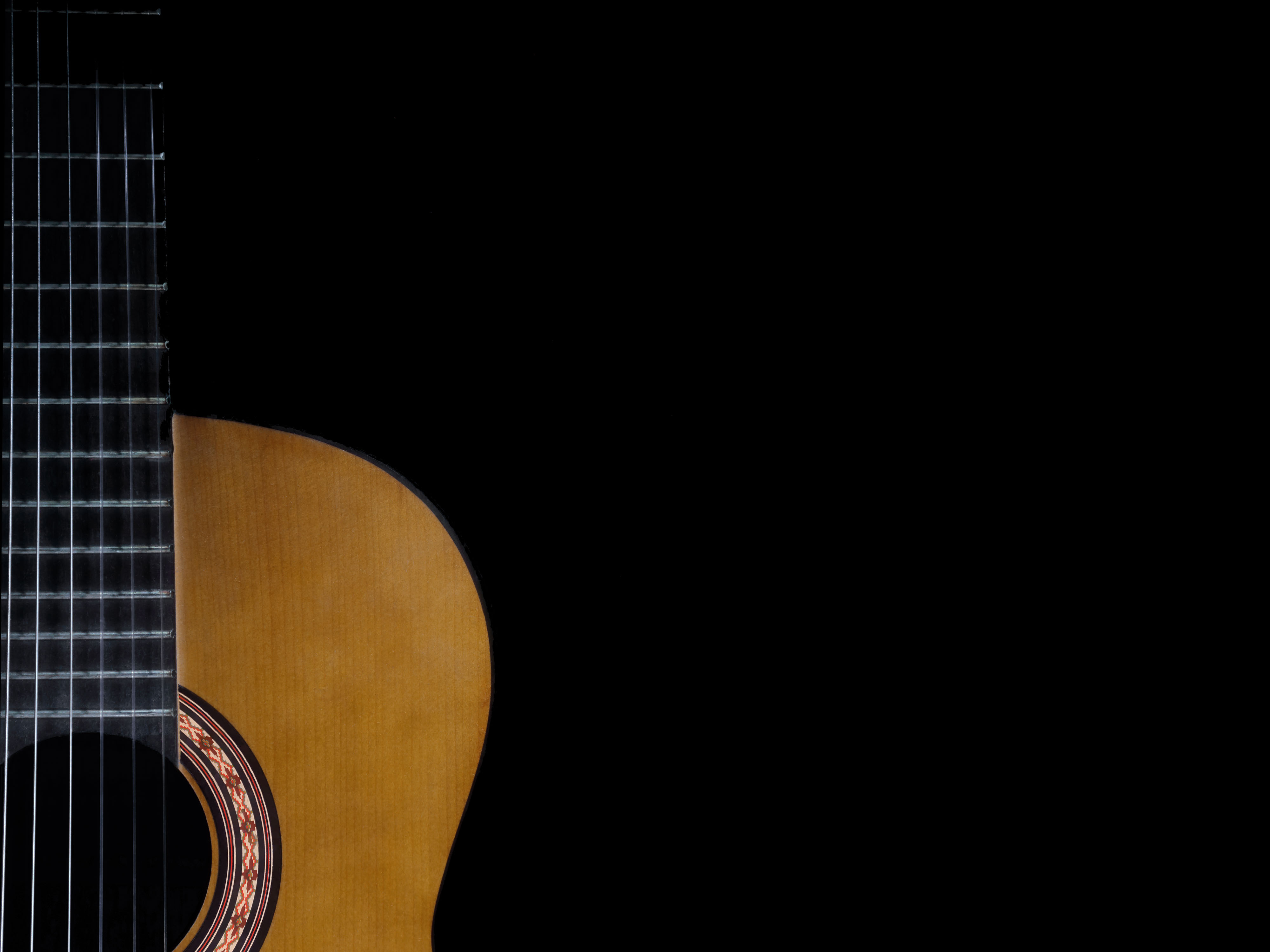 Created with images by KilmerMedia - "Part of a vintage, nylon string acoustic guitar body and neck are shown isolated, with solid black copyspace / text space to the right." • Roman - "Repairing of broken string on acoustic guitar"