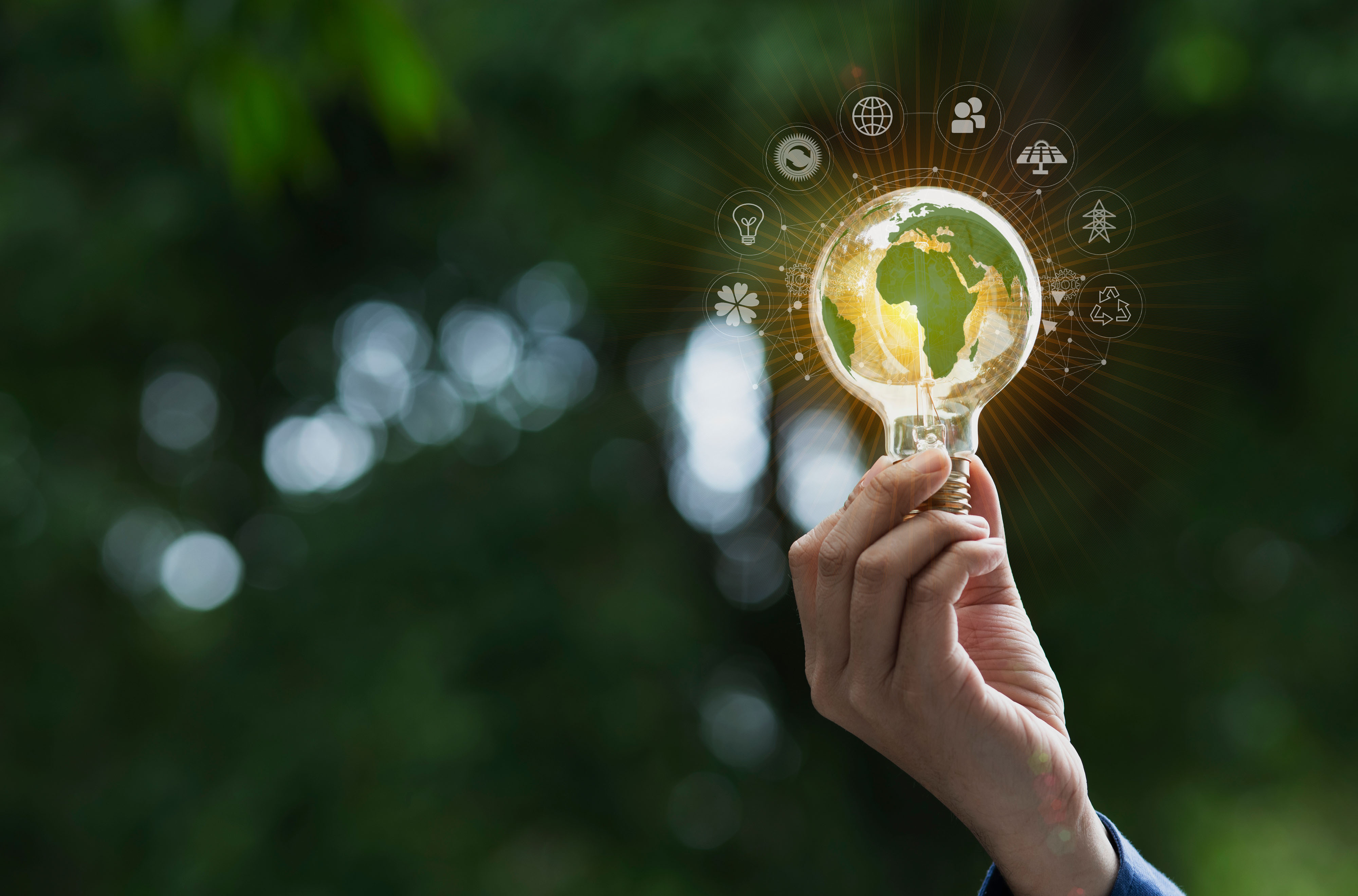 Created with images by Charlie - "carbon footprint in a big green forest" • edb3_16 - "Beautiful Aerial Panoramic View of Kennedy Lake during a vibrant sunny day.,Located on the West Coast of Vancouver Island near Tofino and Ucluelet, British Columbia, Canada." • gkrphoto - "Wind farm on Kashubian - Poland" • lovelyday12 - "hand holding small tree for planting.,concept green world" • lovelyday12 - "globe glass on grass with sunshine.,environment concept" • zhengzaishanchu - "Solar photovoltaic panels and wind turbines" • Kalyakan - "Container ship unloading in deep sea port, Global business logistic import export freight shipping transportation oversea worldwide container ship, Container vessel loading cargo cargo freight ship." • SOMKID - "Hand holding light bulb and sustainable development interface icons on green background, Technology and environment concept." • -Quantum Pixels- - "ESG factors are essential for enhancing sustainability and corporate responsibility in businesses encompassing environmental impact social responsibility governance practices and sustainability re" • Proxima Studio - "Renewable energy, ecology concept with tree" • AdobeTim82 - "Springtime forest with setting sun shining through leaves and branches.,Nature, forestry, habitat, environment and sustainability concepts"