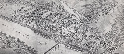 Map of Frenchtown with a line of rafts floating along the Delaware, 1883
