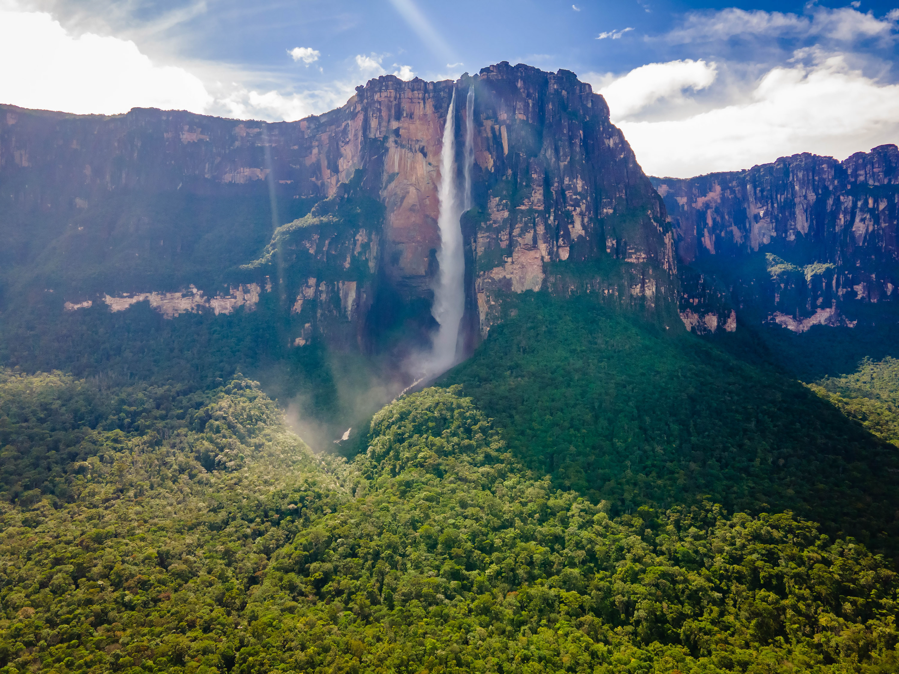 Angel Falls is one of the world's most iconic waterfalls and is located in Venezuela. It is the world's tallest uninterrupted waterfall cascading from the flat-topped plateau, Auyán-Tepuí, also known as “Devils Mountain”, falling a total of 3,212 feet into a wide base stretching 500 feet wide.