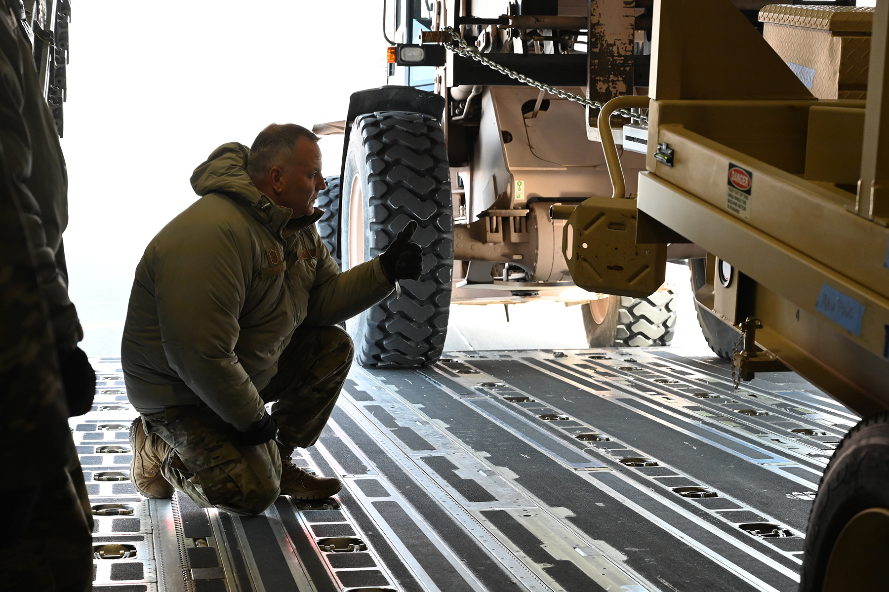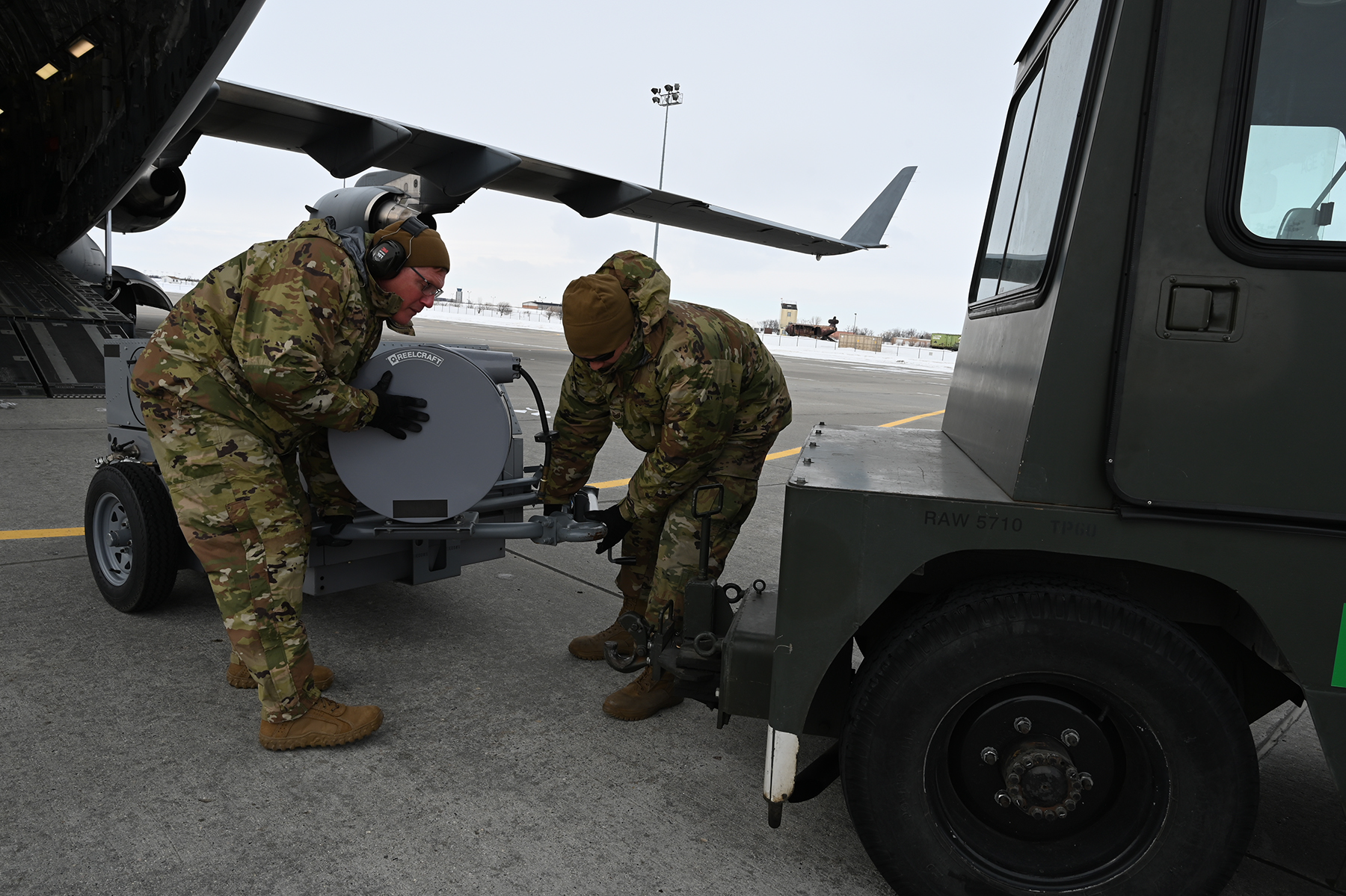 Senior Master Sgt. Les Ressler provides hand signals as cargo is unloaded from a C-17 Globemaster at the Air National Guard Base in Fargo on Feb. 15. The equipment was used in Southern Strike 2020.