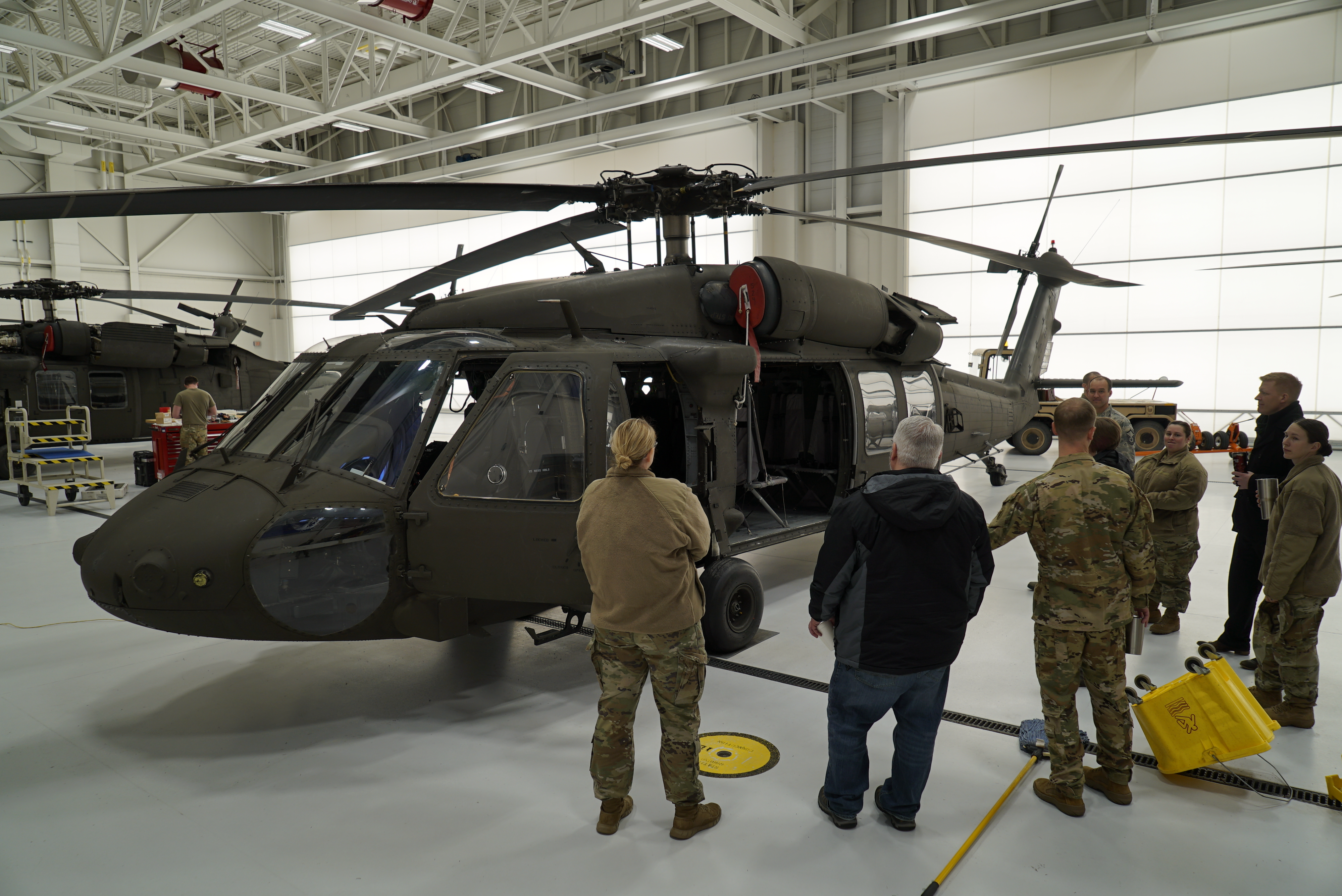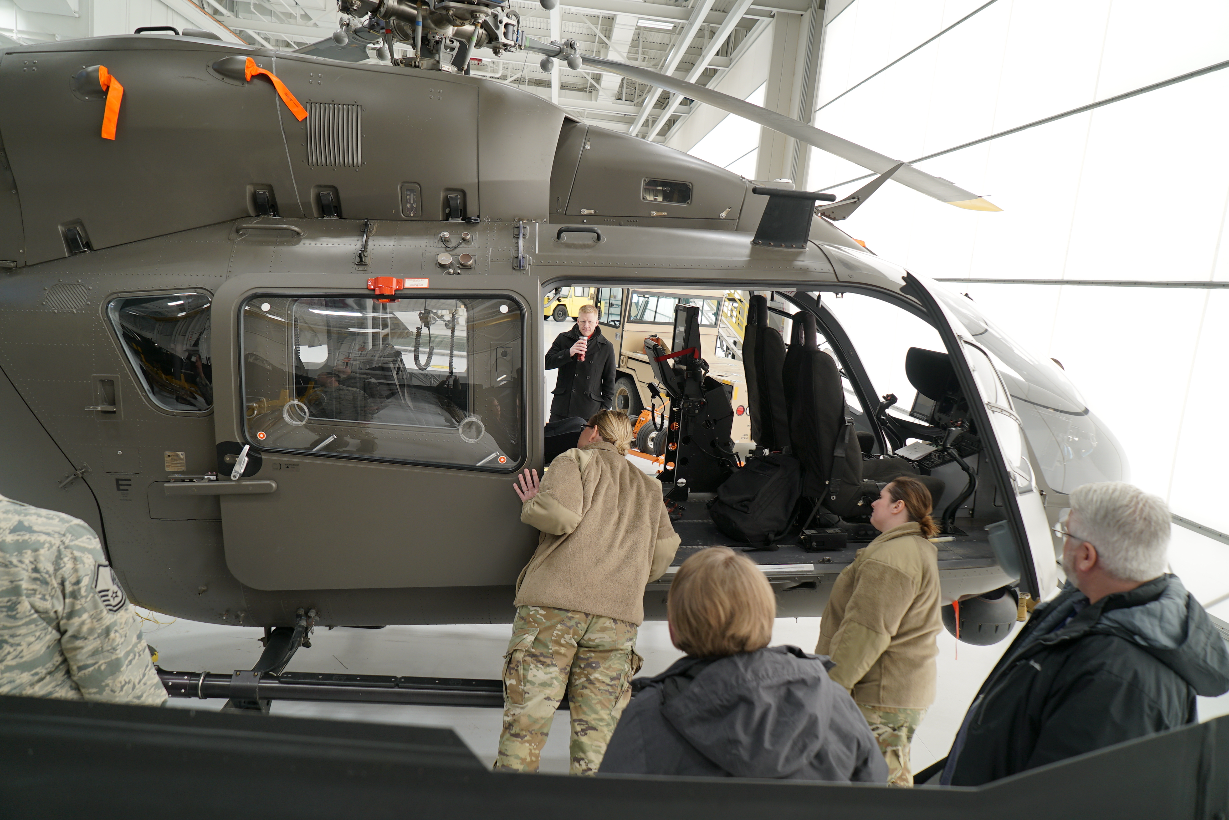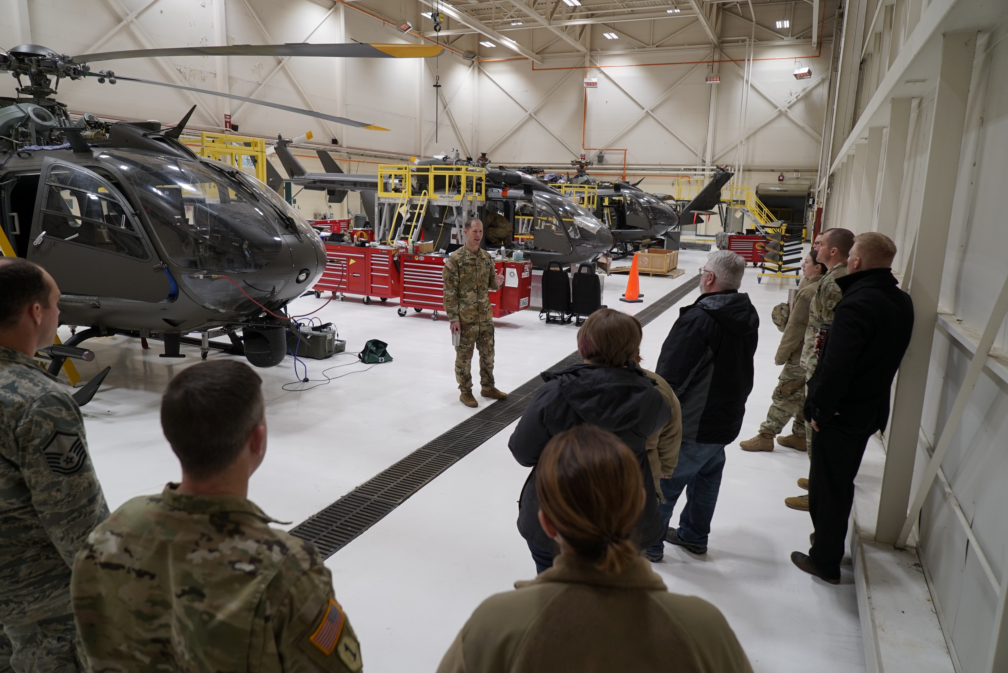 Chief Warrant Officer 3 Brent Freese (third from left) C Company, 2nd Battalion, 285th Aviation Regiment (ASSAULT) addresses members of the Employee Advisory Board during a tour of the N.D. National Guard's Army Aviation Support Facility on Feb. 19.