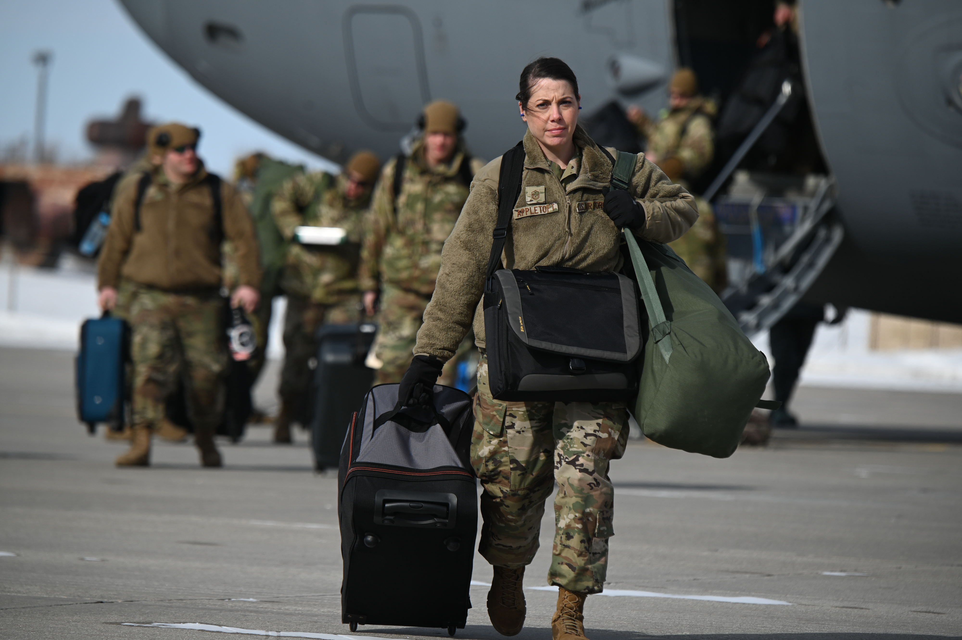 Photo: Master Sgt. Kari Appletoft arrives on the flight line at the Air National Guard Base in Fargo upon returning from Exercise Southern Strike 2020 on Feb. 15.