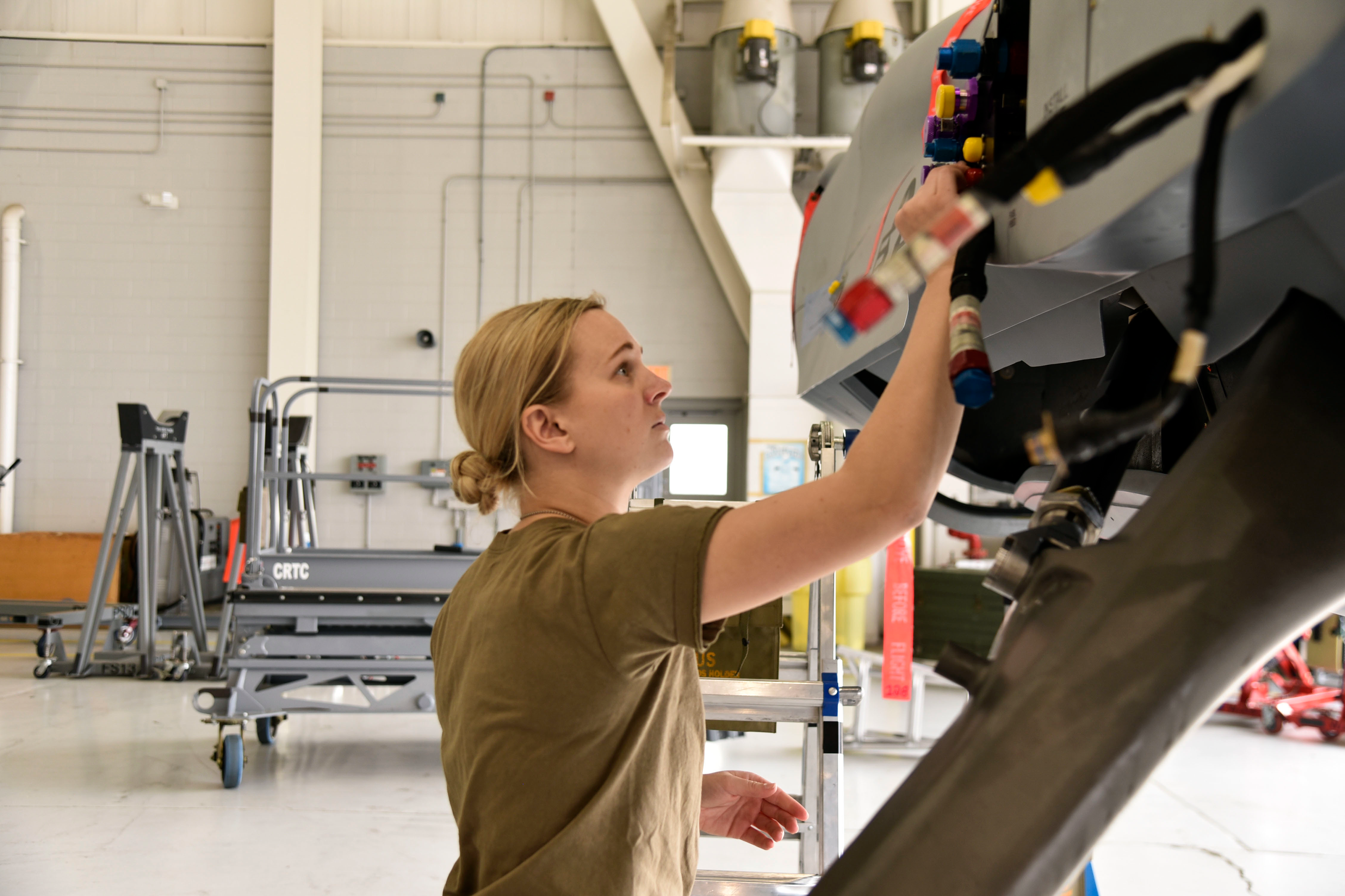 Senior Airman Gretchen Freed prepares an MQ-9 Reaper for transport home to Fargo on Feb. 11 during exercise Southern Strike 2020 in Mississippi. As a Reaper crew chief, she is responsible for launch and recovery of the aircraft.