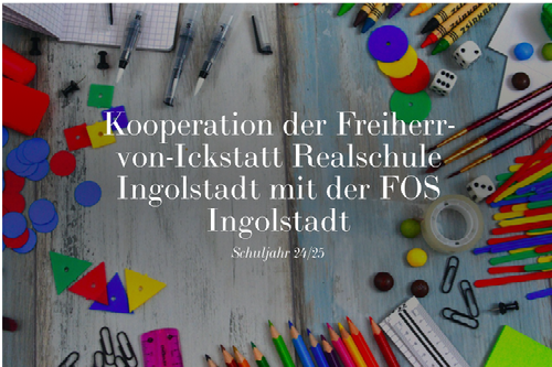 - Elterninfoabend zum „Übertritt an die FOS“ am 19.09.2024 von 19.00 Uhr bis 21.00 Uhr für die Eltern der 10. Jahrgangsstufe (Frau Hoffmann-stellvertretende Schulleiterin an der Freiherr-von-Ickstatt Realschule, Herr Schmidmeier-Studiendirektor und Frau Schwarz-Studienrätin an der FOS Ingolstadt)