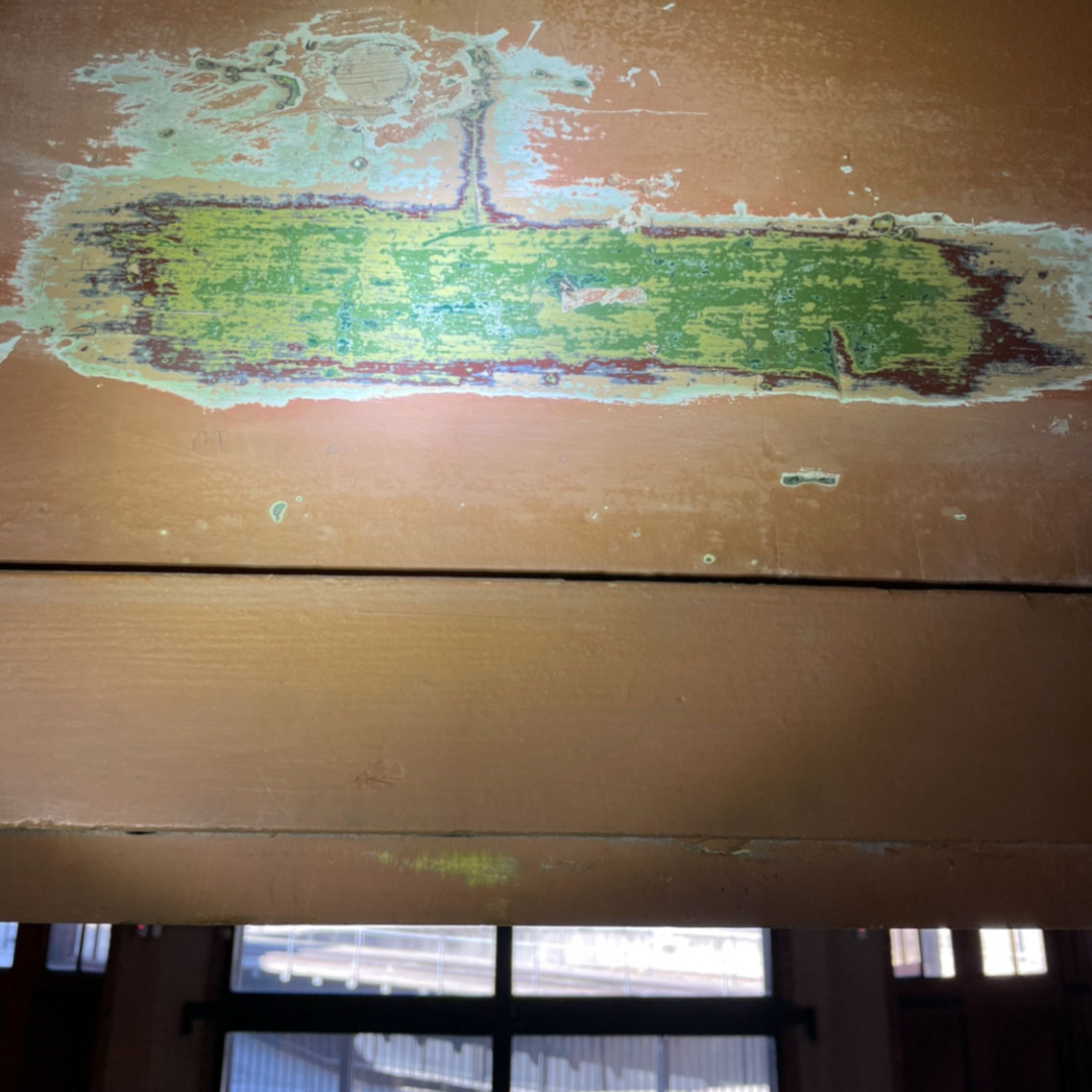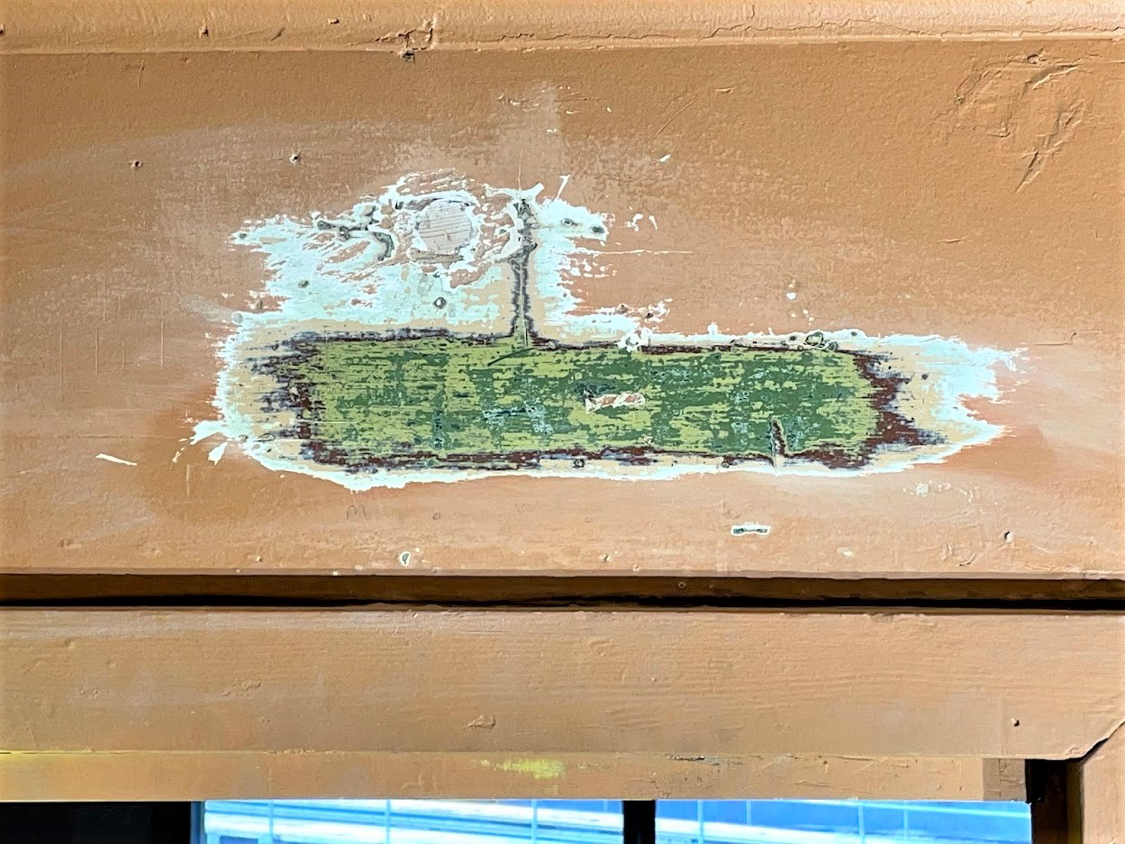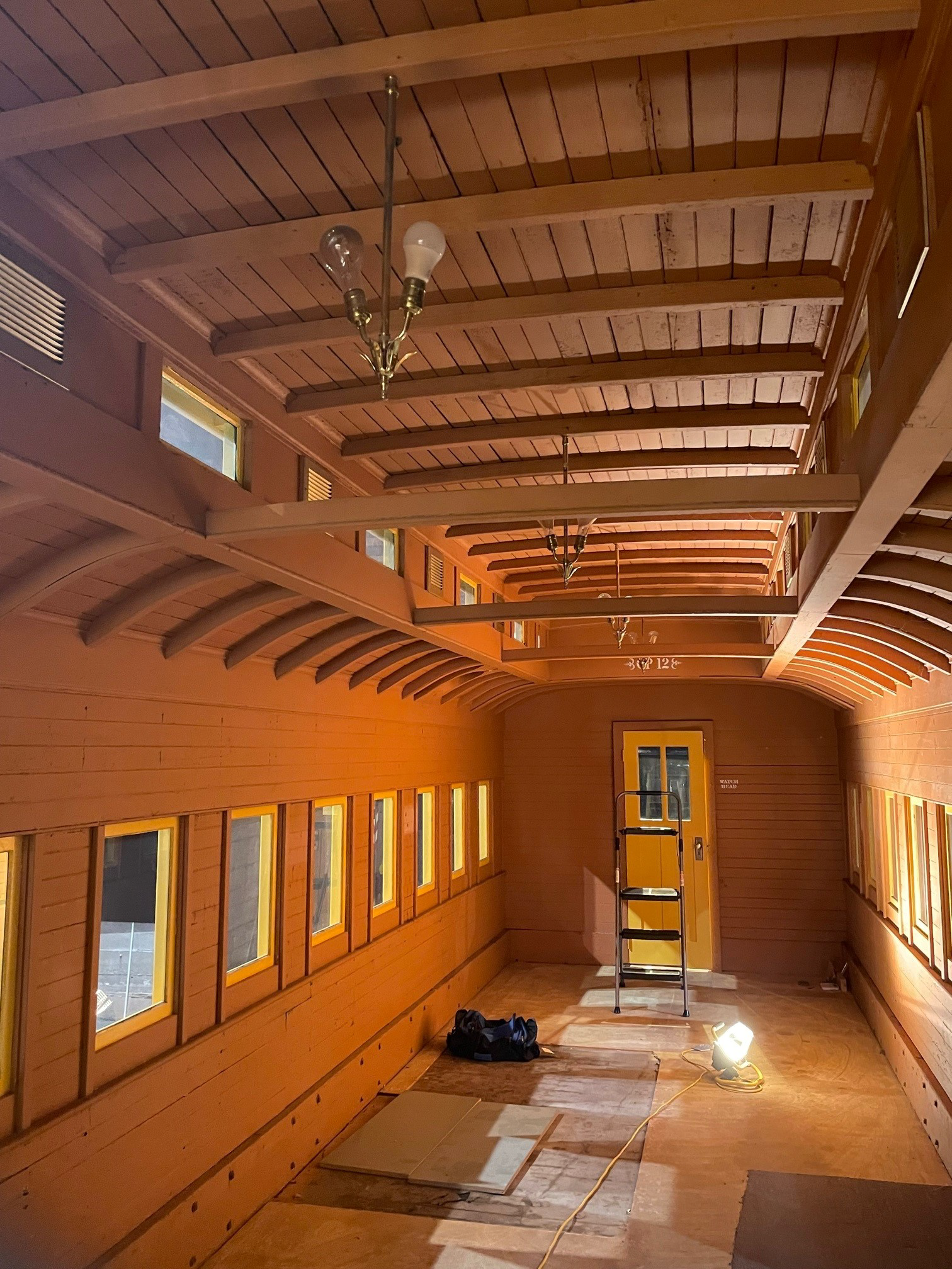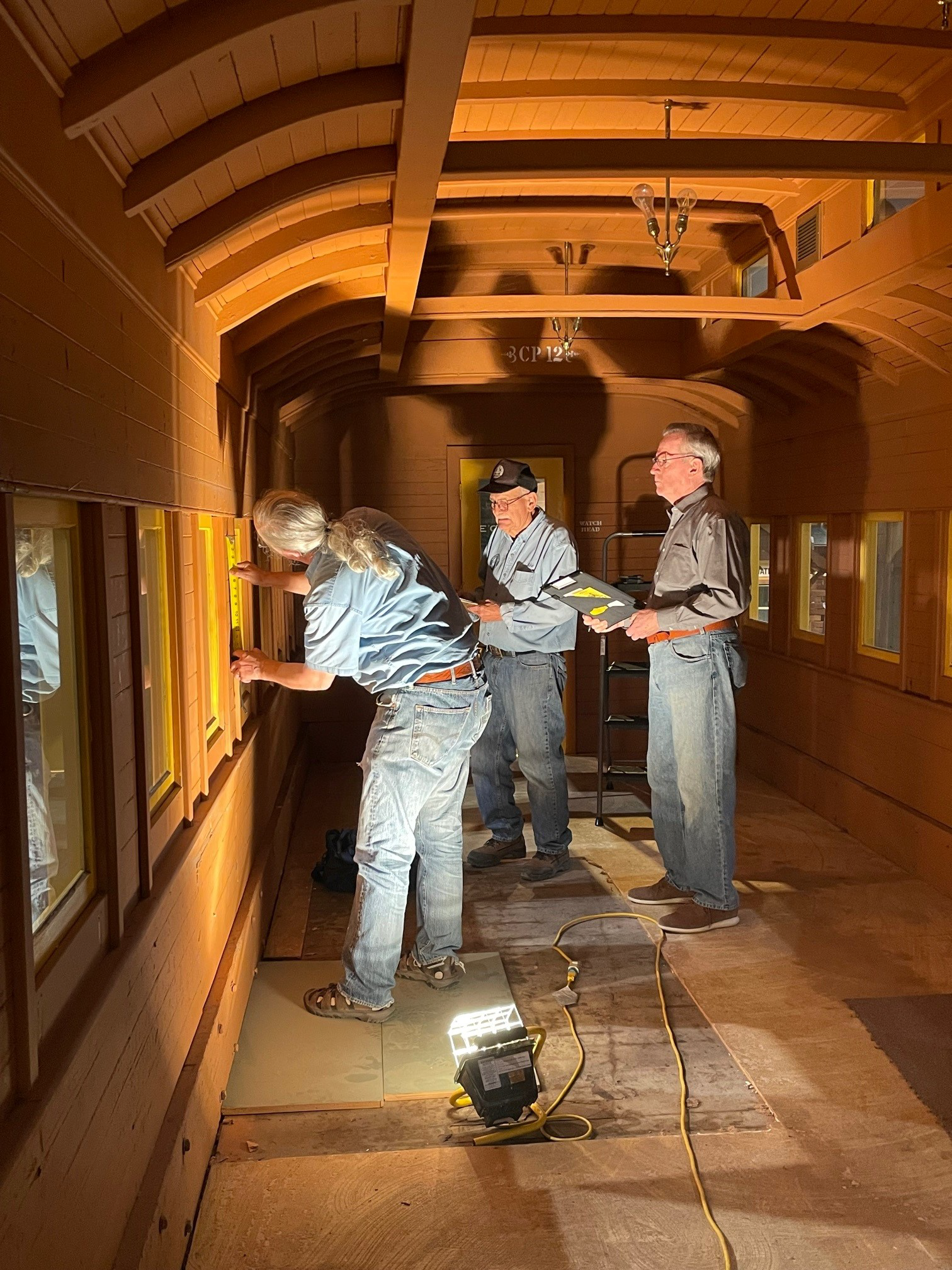 ¿Dónde miraron? Encima de la puerta ubicada en el este del vagón (en la foto). ¿Cómo se veían? Tuvieron que quitar dos docenas (o 24) capas de pintura y barniz para encontrar el número del vagón. ¿Qué número encontraron? SPMW 76. (SPMW significa Southern Pacific Maintenance of Way).