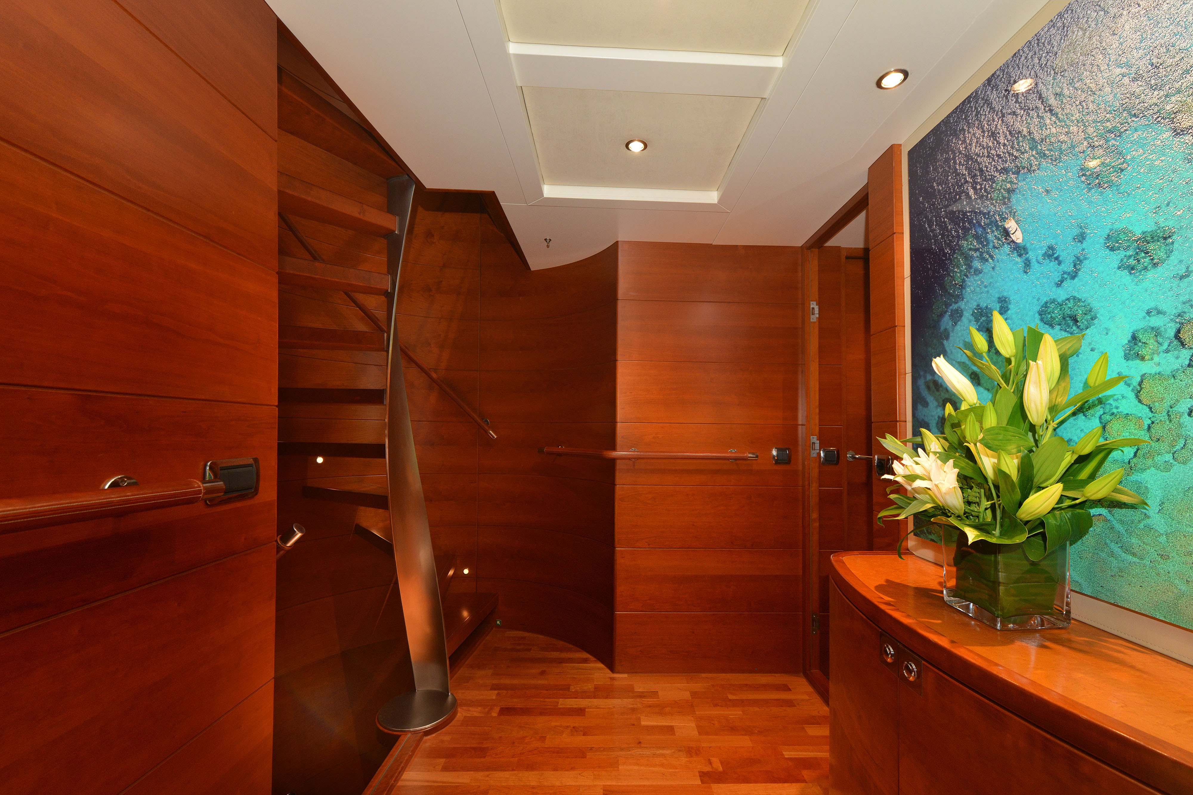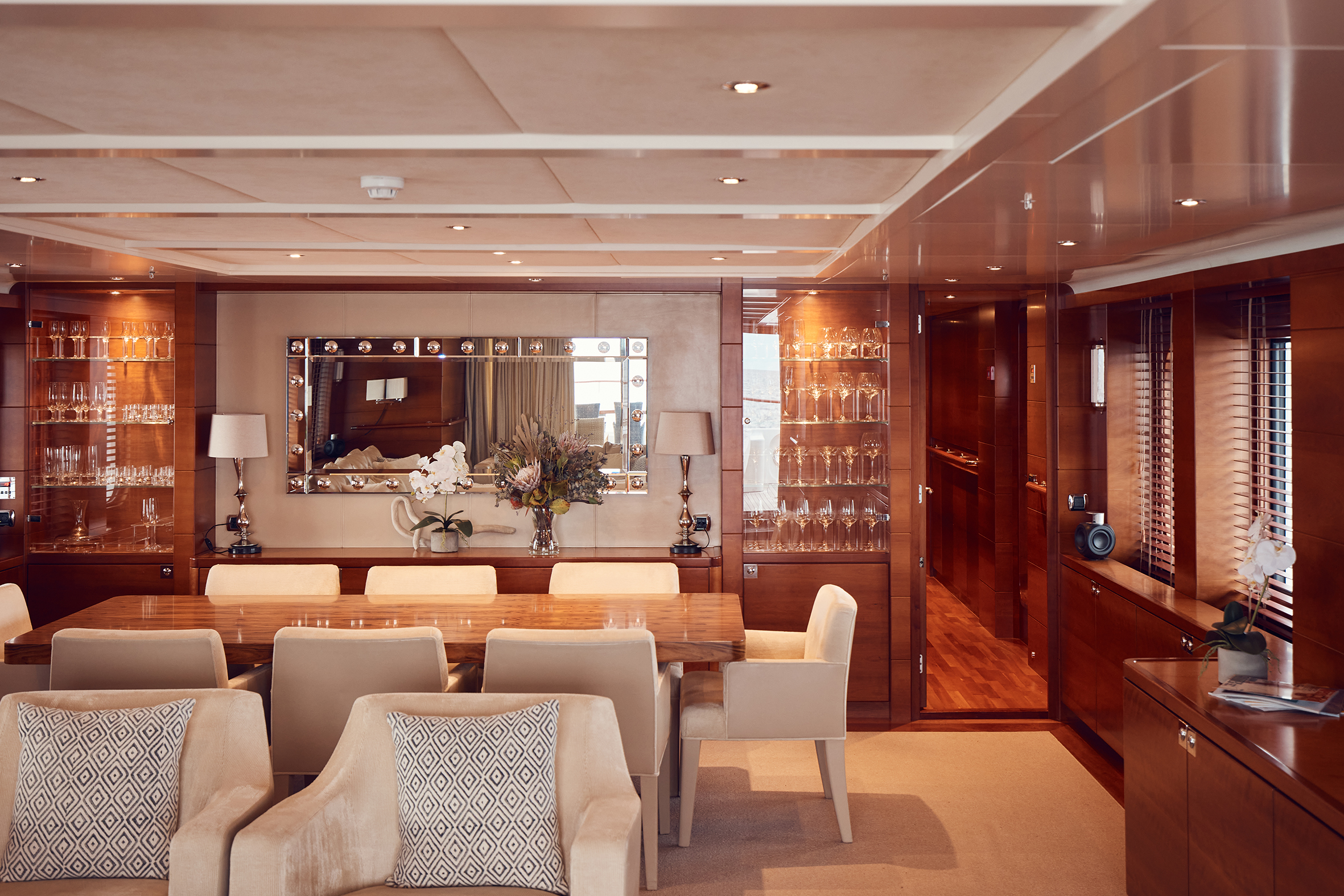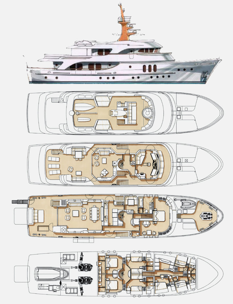 Accommodation | 5 Cabins (full beam Master on main deck with private office, 2 x Double with splitting partition to convert beds in 2 x single, 2 x Twin with Pullman)