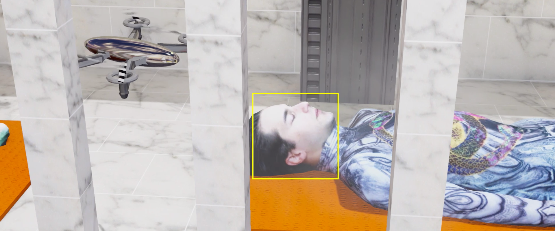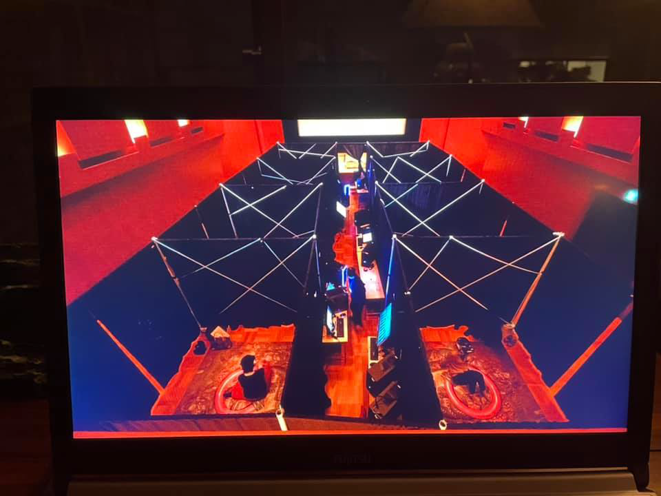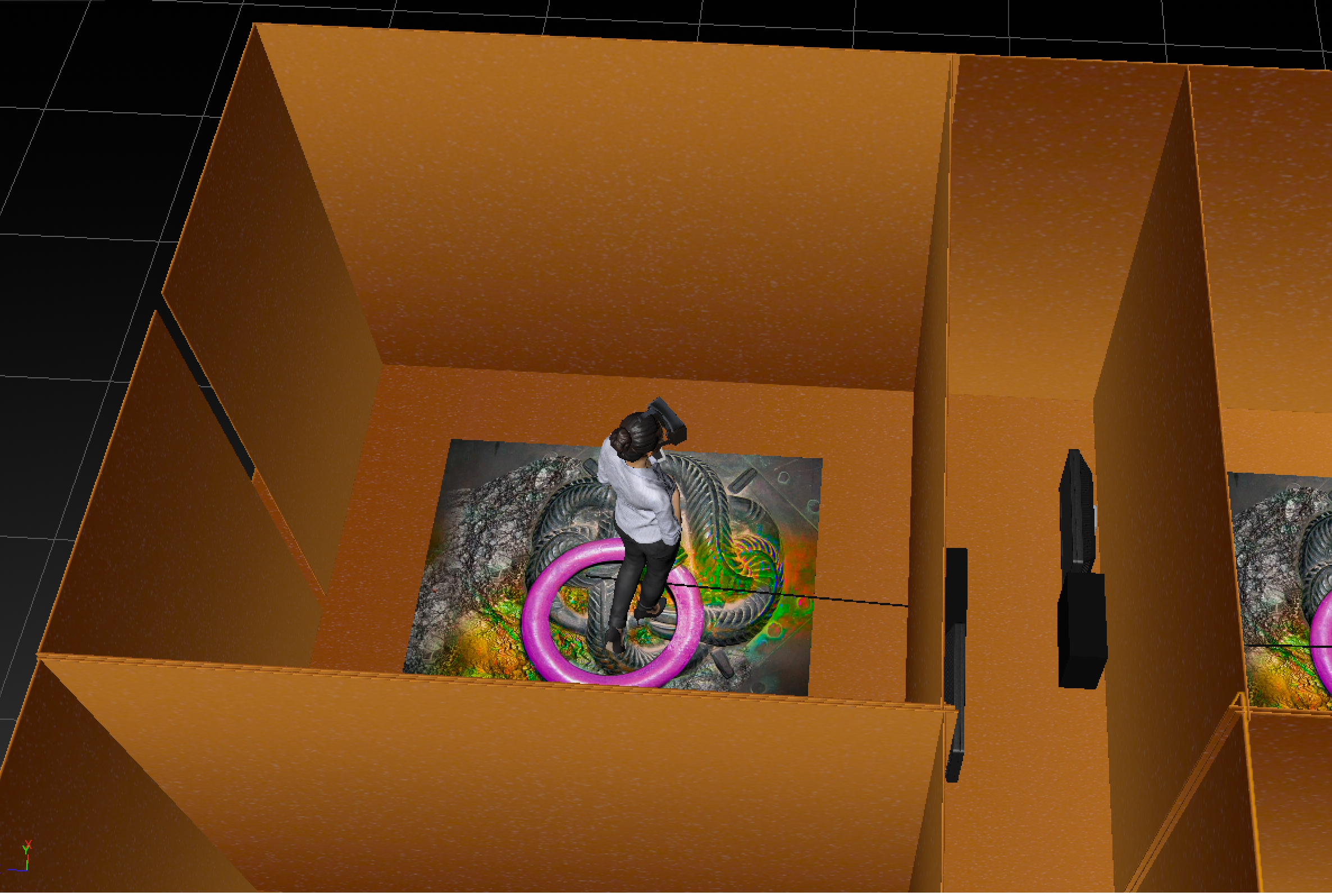 In the installation sketch, the original setting of the VR performance becomes visible. The participants experience the virtual reality individually in the protected space of a fabric-covered cube/unit. The number of cubes/units is open and to be decided by the presenting venue/festival. The setting outlined in this way can thus be adapted to any hygiene concepts of the future.