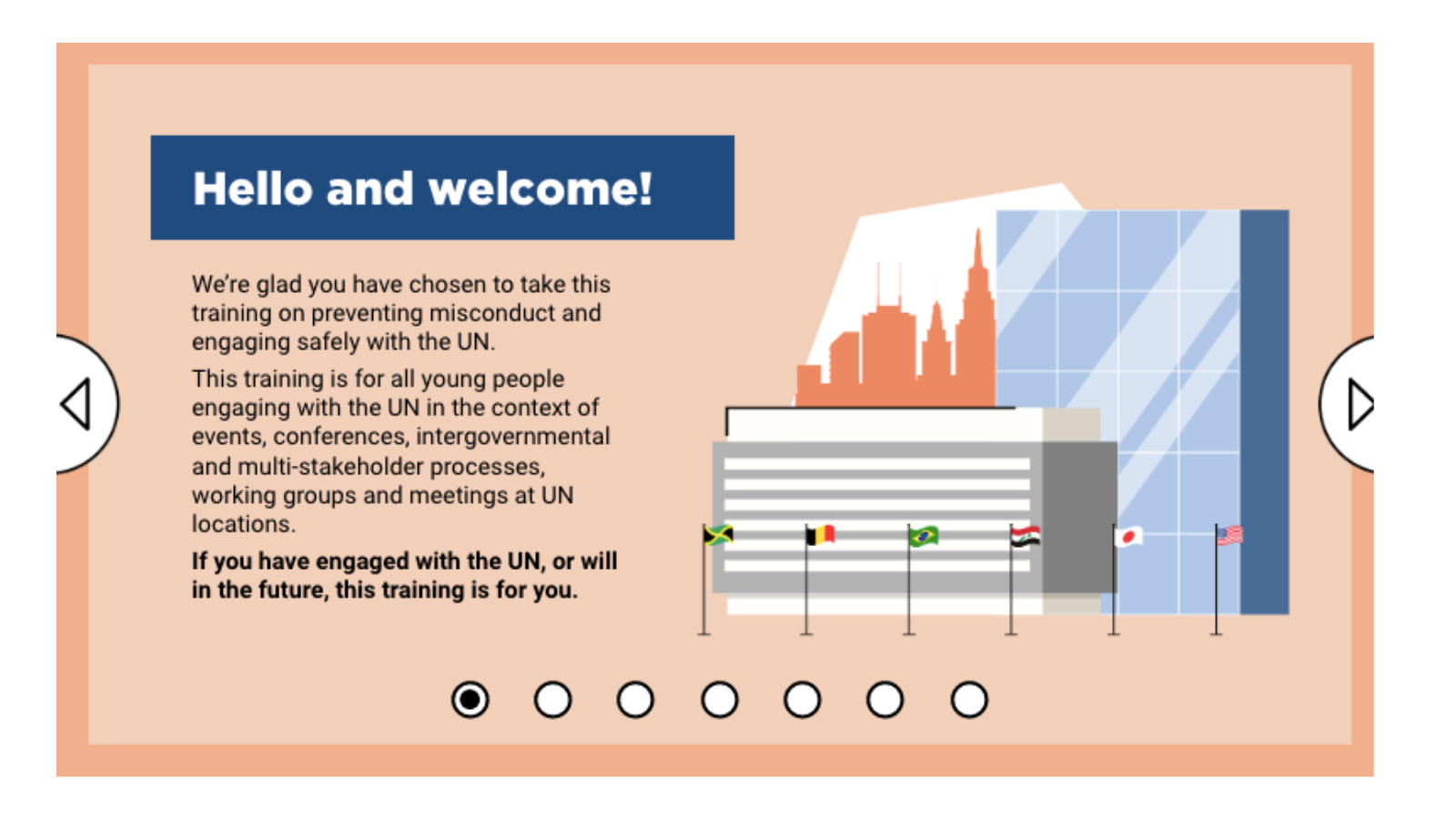 As a core component of this work, together with partners across the UN system we actively promoted the virtual module Engaging Safely at the UN – a training for Young People as the primary youth-sensitive online training on preventing abuse of authority, discrimination, harassment, including sexual harassment, and Sexual Exploitation and Abuse (SEA), in the context of young people’s engagement with the UN.