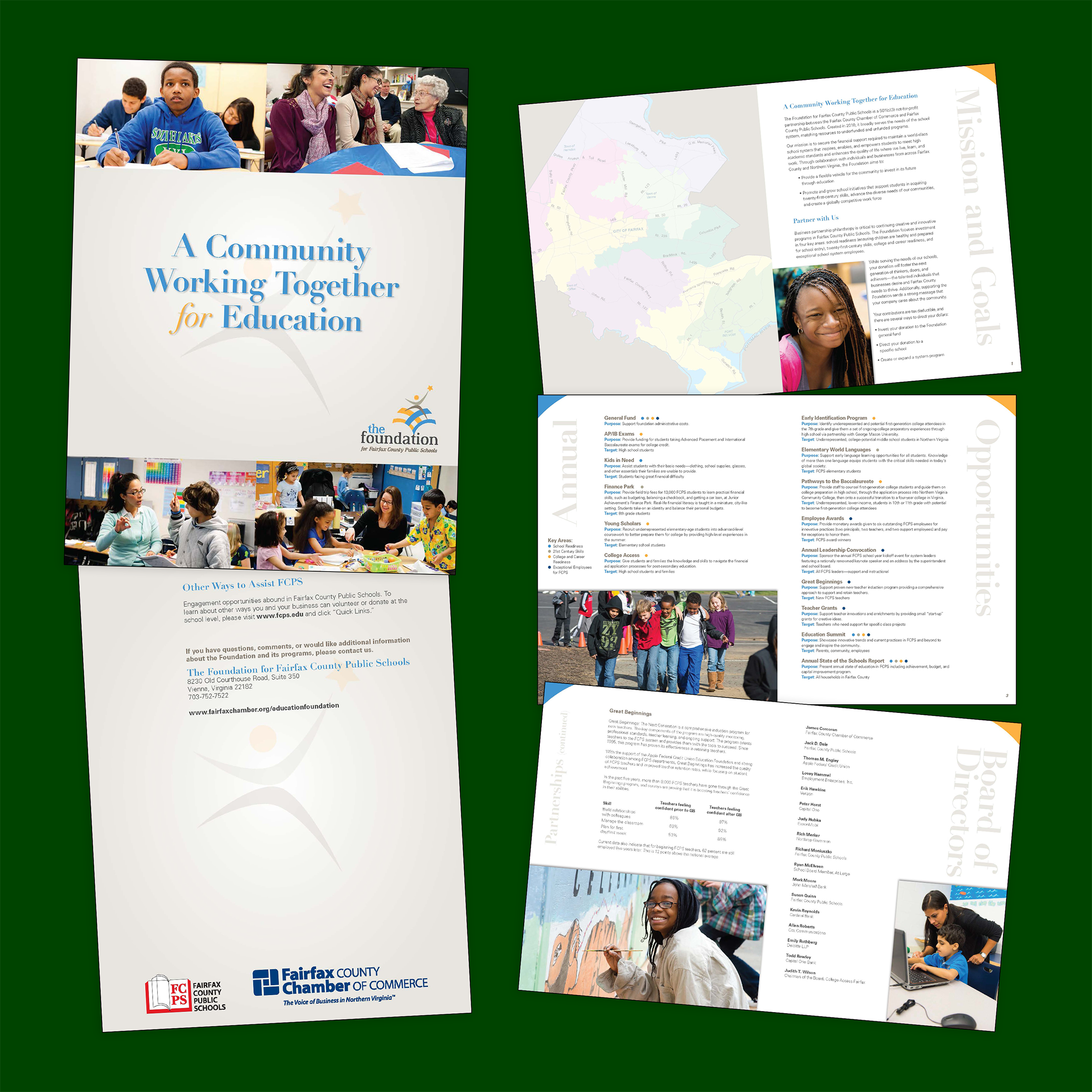 Multi-page publications ranging from brochures to books and catalogs have been a core of my design and production work since the days of scale wheels and blue lines. I love the tactile aspects of speccing paper and going on press, but what I most love is the ability to dig into everything from working with photographers and writers to finding a balance between creative and functional in order to meet a client's needs. The Fairfax County Public Schools Foundation report shown here, and produced in conjunction with Capital One, is a prime example of work that hit the right notes for both the internal (C1) and external clients.