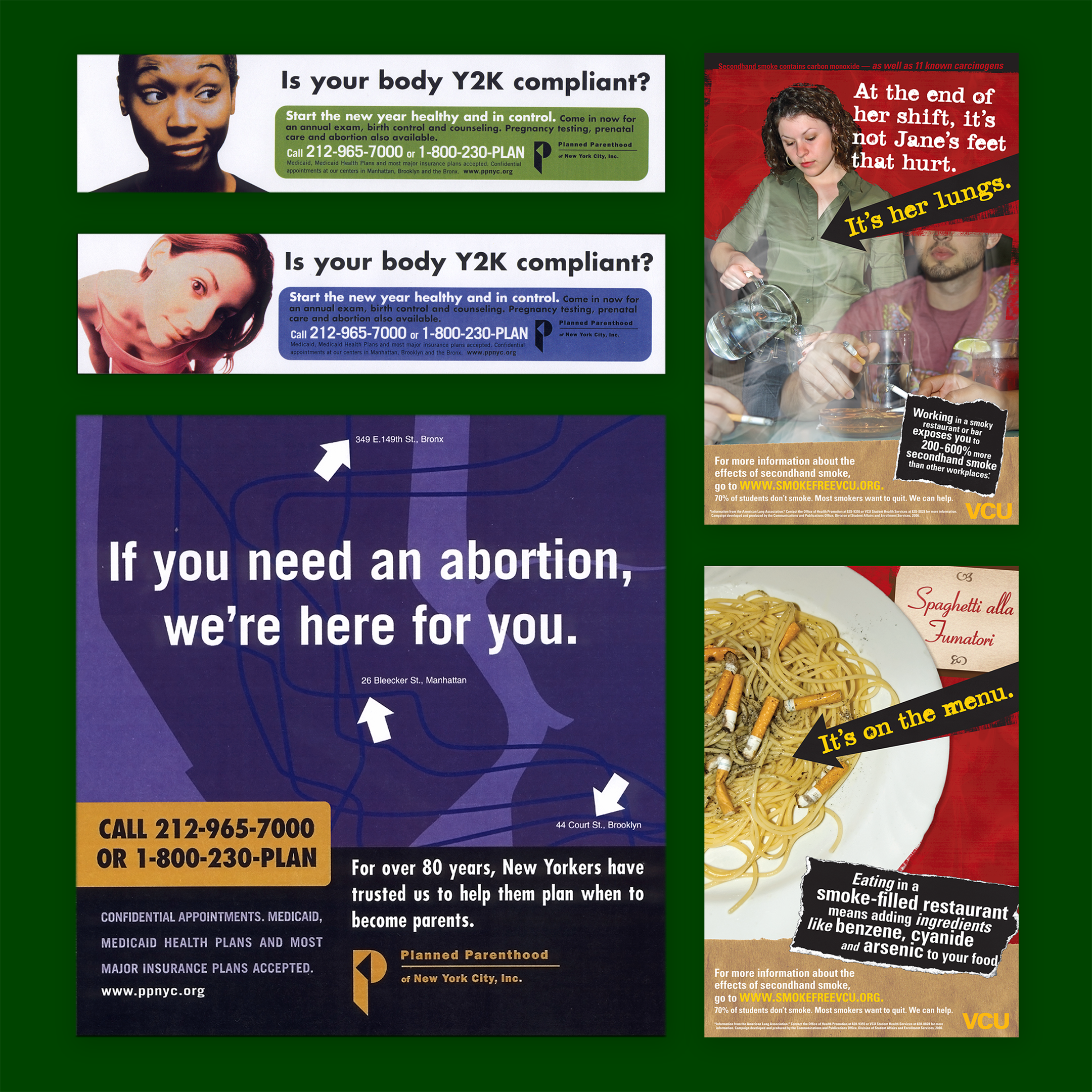 In the second campaign shown here, my communications studio at VCU received a two-year grant to produce a series of posters educating students on specific dangers of second-hand smoke. With a battle over smoking in restaurants brewing, we opted to shoot in a location known for both its food and the murkiness of its air. A related campaign was later adapted for use by other state agencies.