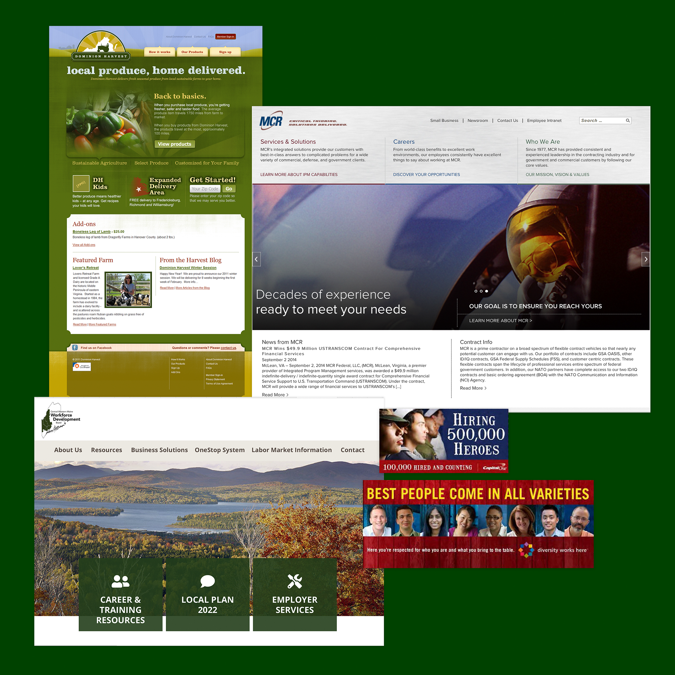 Dominion Harvest came to Top Dead Center Design for whom I was freelancing to redesign their website and collateral. The original branding had been done by another designer, but we worked with it to extend it out through a robust, member-focused site and print collateral.