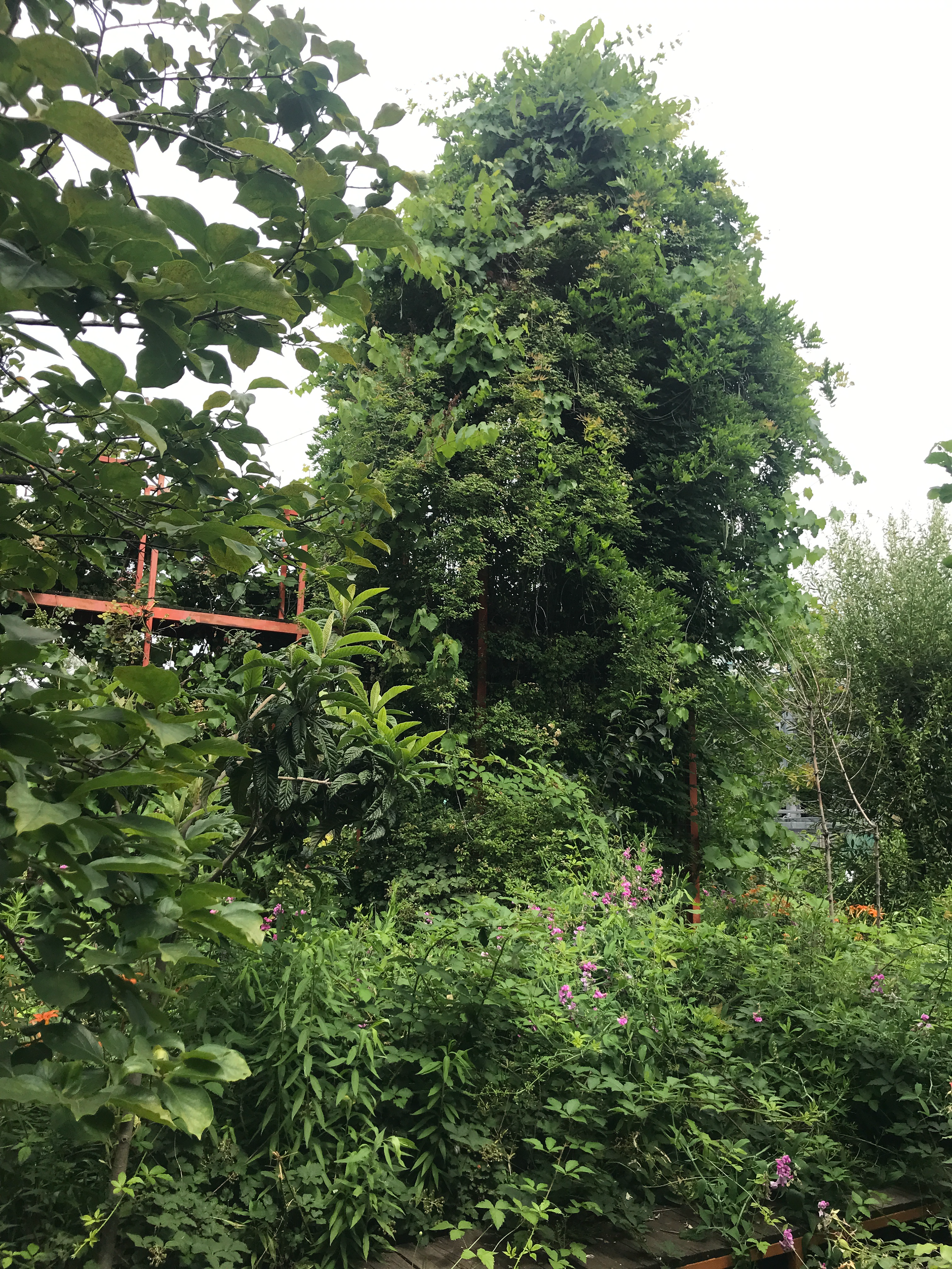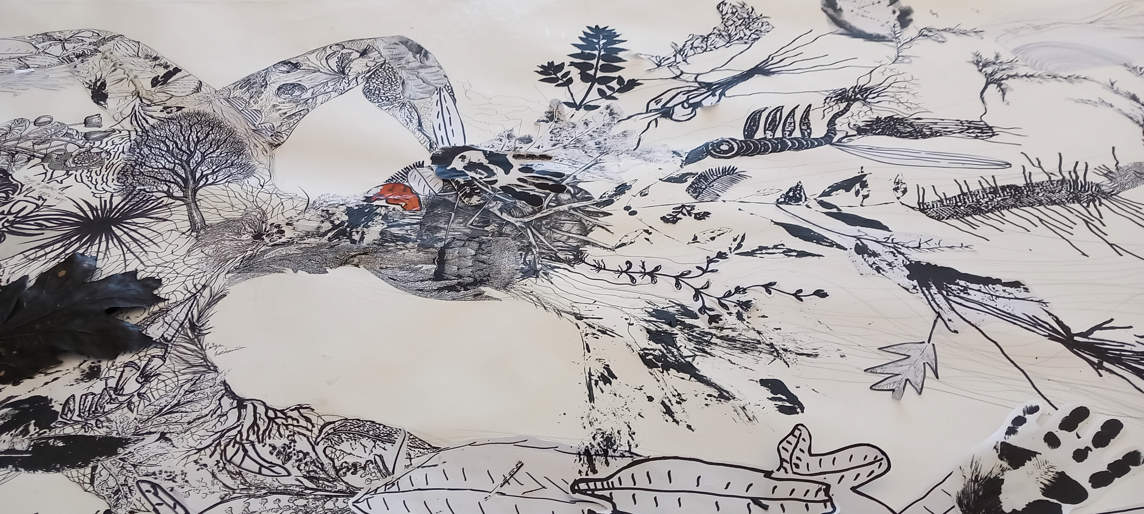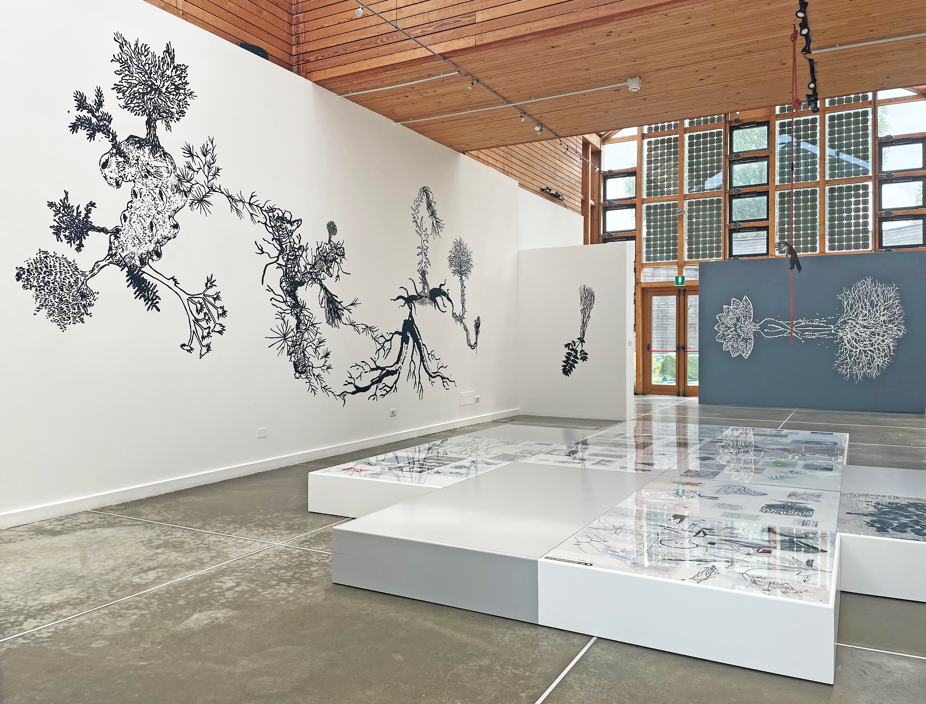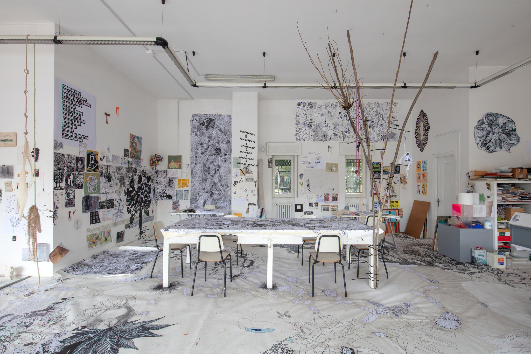 I disegni a parete sono pensati in relazione all’opera calpestabile con l’intento di ampliare i contenuti attraverso un principio di reciprocità. Le raffigurazioni rimandano agli erbari fantastici del naturalista cinquecentesco Ulisse Aldrovandi e sono il frutto di un’elaborazione collettiva durante la quale centinaia di disegni sono stati amalgamati attraverso lo sviluppo di suggestioni tematiche quali: lo stomaco della foresta, l’intestino delle radici, le arterie delle liane. Un processo di trasformazione e di valorizzazione della diversità che ricostruisce un ecosistema basato sull’interdipendenza e la varietà degli organismi che lo compongono. Una serie di incroci e innesti di molteplici piante e differenti radici danno forma ad organi diffusi simili a colonie, nelle quali emerge un senso di collettività proprio delle piante. Un erbario che non ha frontiere e favorisce la condivisione con altre forme di vita.
