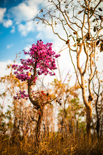 Há muitas flores no Cerrado. Muitos tons. Isso porque, já sabemos, o Cerrado possui características climáticas bem peculiares. São duas estações bem definidas. Uma chuvosa, que se inicia entre setembro e outubro e se estende até março e abril. Entre novembro e janeiro a chuva é mais generosa. Depois é que vem uma estação seca. Onde as chuvas se tornam lenda, uma lembrança. É nesse longo período de estiagem que costumam ocorrer incêndios. O problema é que se antes isso era um fenômeno natural, agora cada vez mais se percebe a ação humana por trás. O ciclo está se alterando. As estações chuvosas estão menores e a seca maior, consequência direta também das mudanças climáticas que cientistas vêm alertando há tempos.