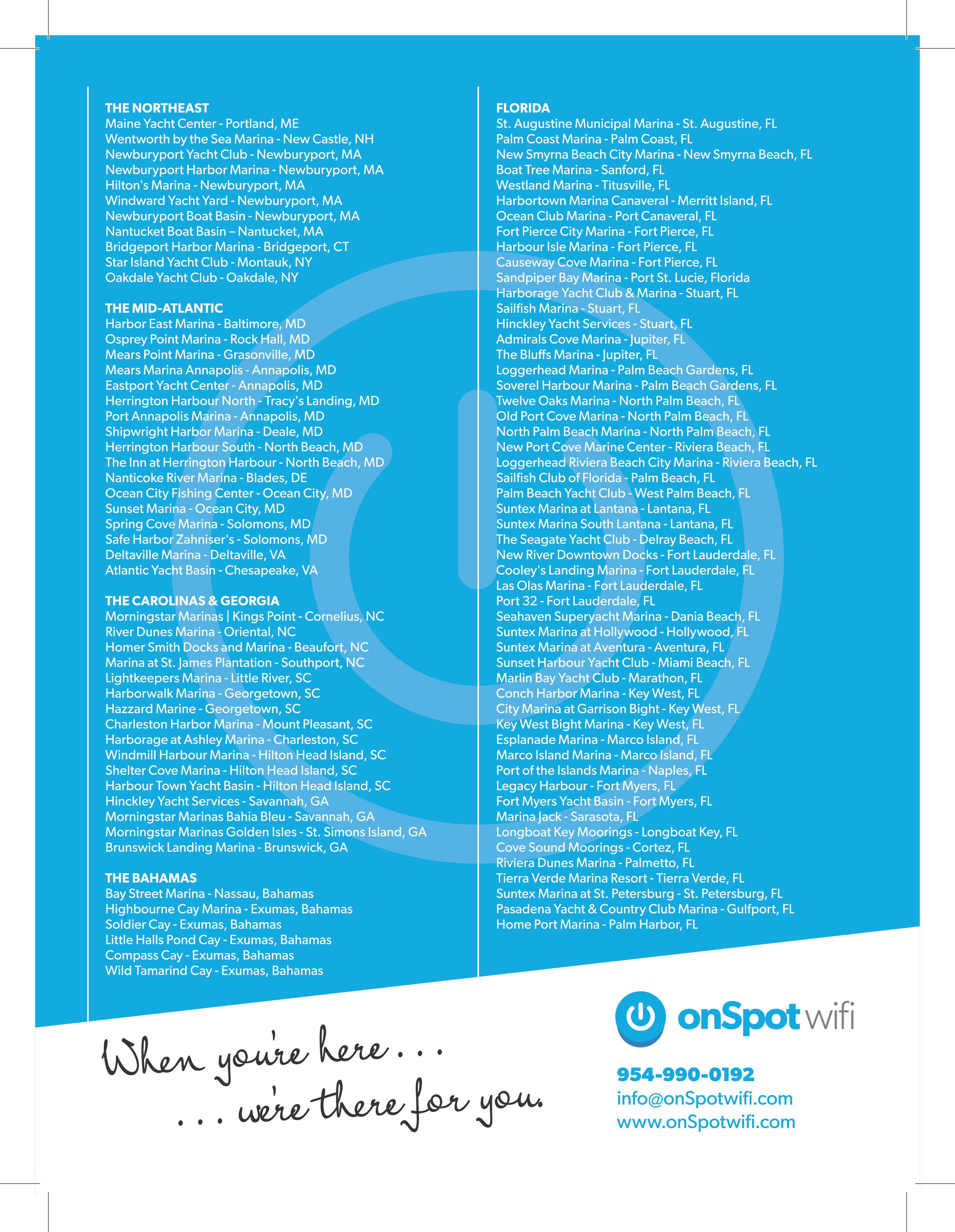 We promote our marinas-onSpot advertises extensively to direct our True Blue boaters to the marinas on our network. Our marketing efforts highlight our marinas, and we take pride in including a list of onSpot's marinas in all of our advertisements. No other Marina WiFi company does this.