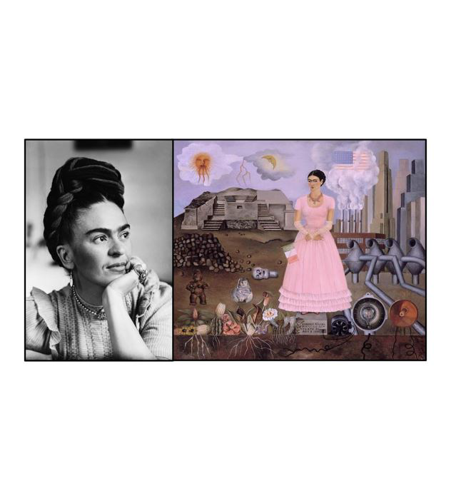 Frida Kahlo was considered one of Mexico's greatest artists. She began painting mostly self-portraits after suffering severe injuries at a young age in a bus accident. Kahlo later became politically active and married fellow artist Diego Rivera in 1929. She exhibited her paintings in Paris and Mexico before her death in 1954. Her painting, Self Portrait Along the Border Line Between Mexico and the United States, was painted in 1932. When Frida came to the United States promoting her artwork, she was very much impacted by the culture shock of the two countries. This painting captures her longing for and her embrace of her rich cultural heritage while crossing the border line into the United States.