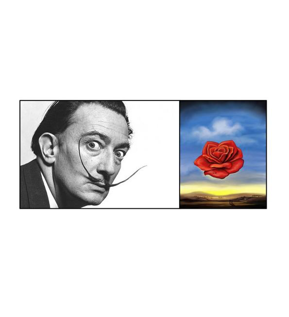 Salvador Dali was a Spanish artist and leading figure in the surrealist movement in the 1920's. Dali is perhaps best known for his melting clocks, featured in his painting The Persistence of Memory. Dali lived in France throughout the Spanish Civil War before leaving for the United States in 1940, where he achieved commercial success. He returned to Spain in 1948. Dali's artistic repertoire included painting, graphic arts, film, sculpture, design, photography, fiction, poetry, autobiography, and essays and criticism. The painting featured on our art wall is Meditative Rose, painted in 1958 during a period of intense spirituality in Dali's life.