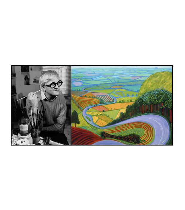 David Hockney is an English painter, draftsman, printmaker, stage designer, and photographer. He's one of the most important figures in contemporary British art due to his work in the Pop Art movement of the 1960s. He is best known for his portraits, photocollages, Splash series of paintings, and plein air (open air) landscape paintings, such as the featured work on our art wall, Garrowby Hill, painted in 1998. He is still active to this day, working with creating digital landscapes on various devices.