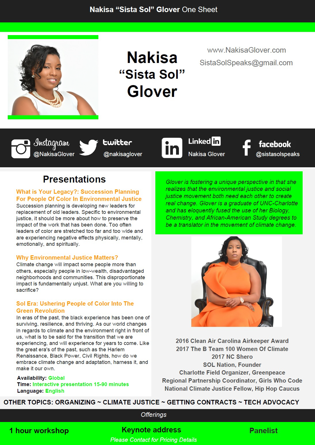 Nakisa has built a local to national track record as a community organizer with years of experience in corporate, community and service-based roles. A trailblazing climate and environmental justice practitioner, Nakisa founded Indy Group Services, to deliver consultant services to local and national partners, including organizations, colleges and universities, government agencies and community groups. She is the Founder of Sol Nation, a Charlotte-based nonprofit that advocates for real solutions for the Charlotte community, and serves in several leadership roles to advance equity and wellness for the community that nurtured her own well-being. These roles include former Regional Partnership Coordinator of Girls Who Code, where she closes gender and diversity gaps in technology; former Think 100% Organizer for Hip Hop Caucus, where she highlights solutions to climate change and environmental injustices to help make Think 100% The Coolest place in the climate movement.