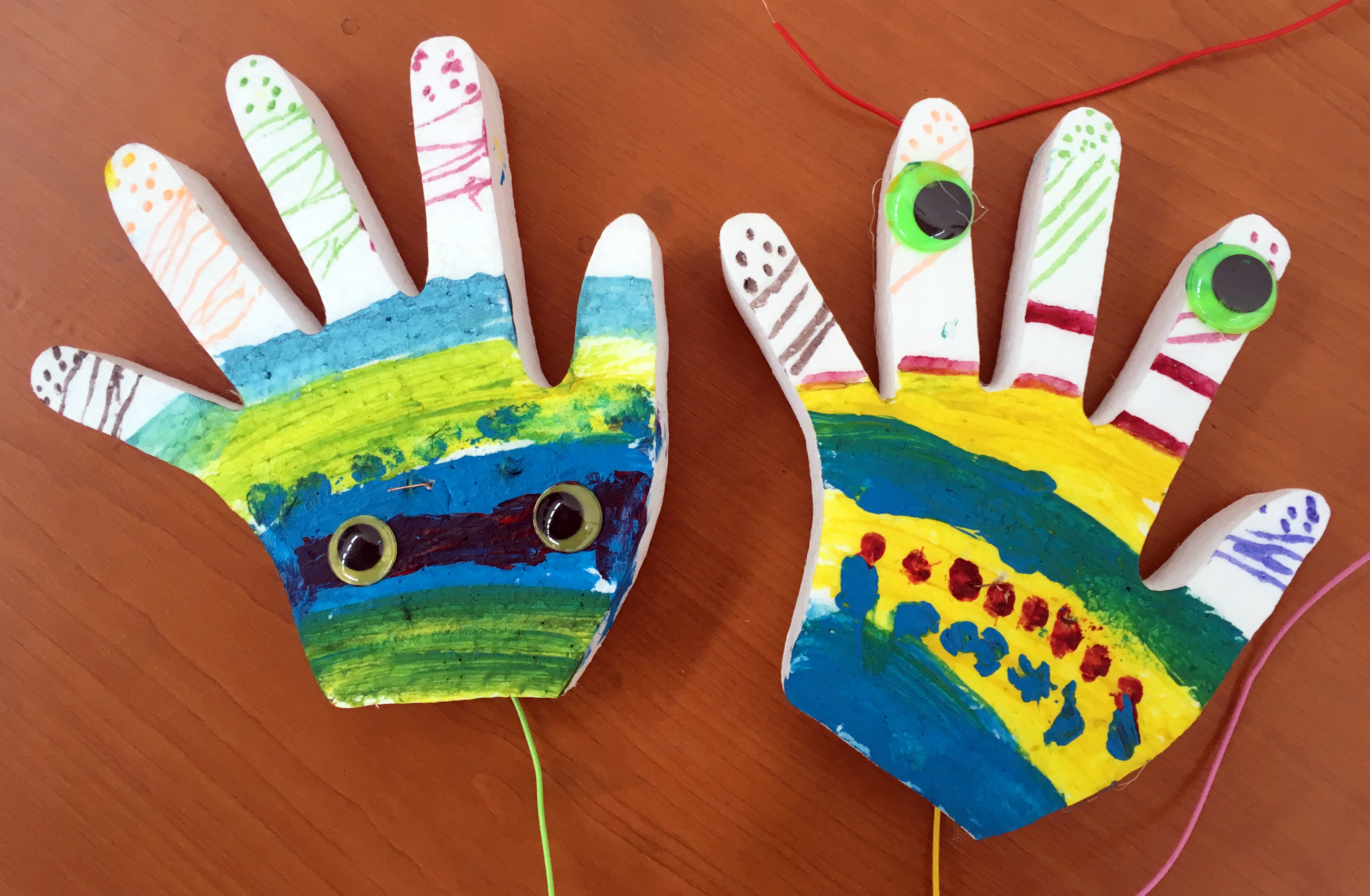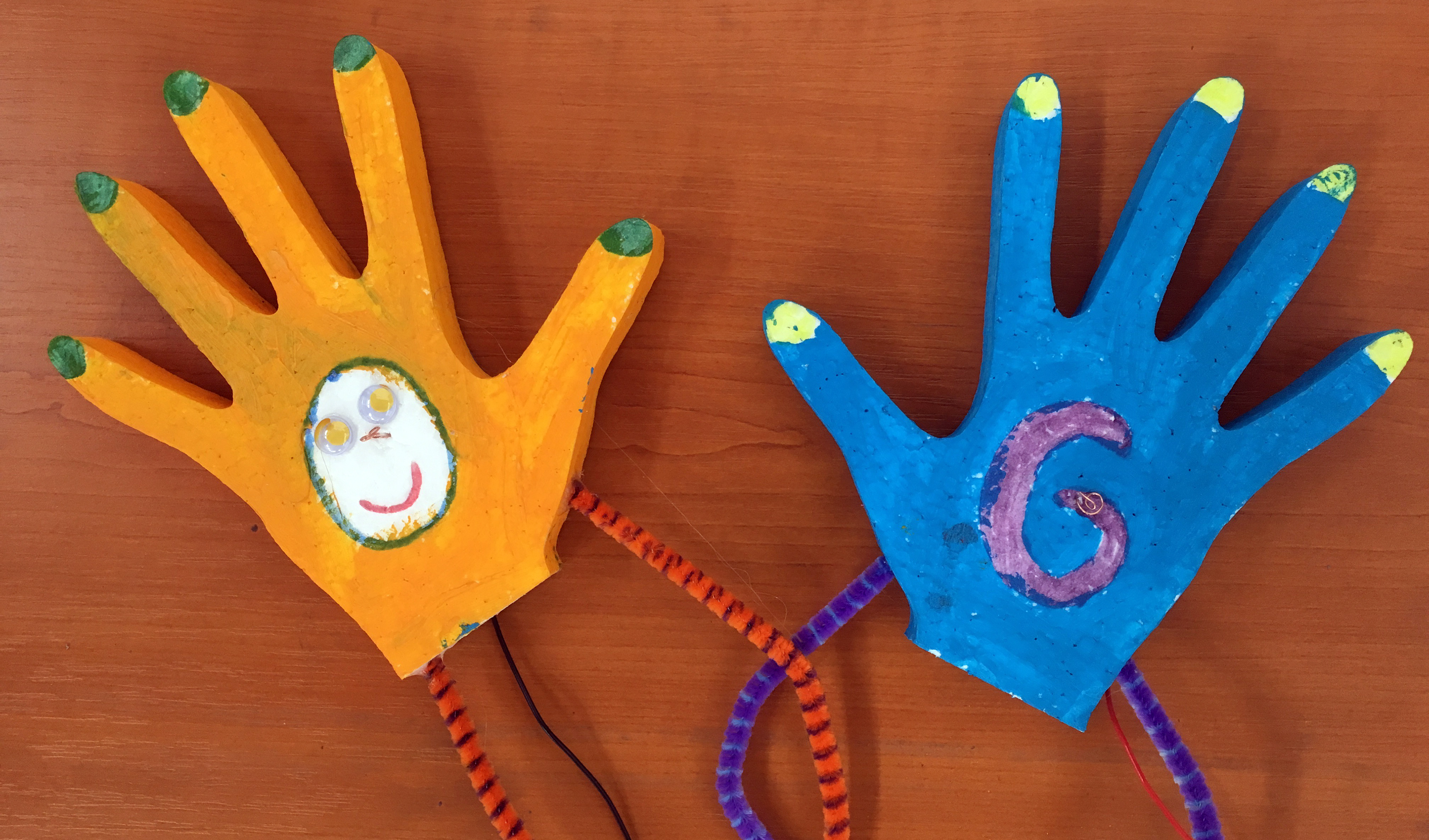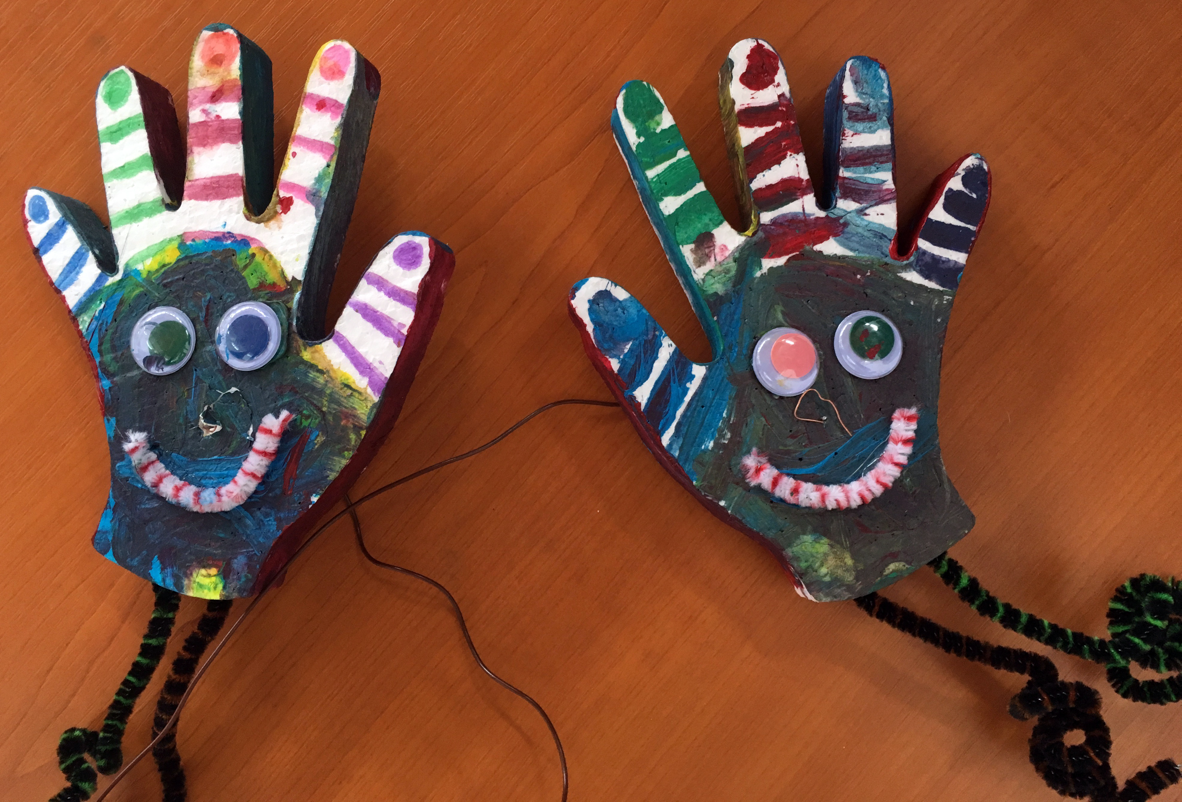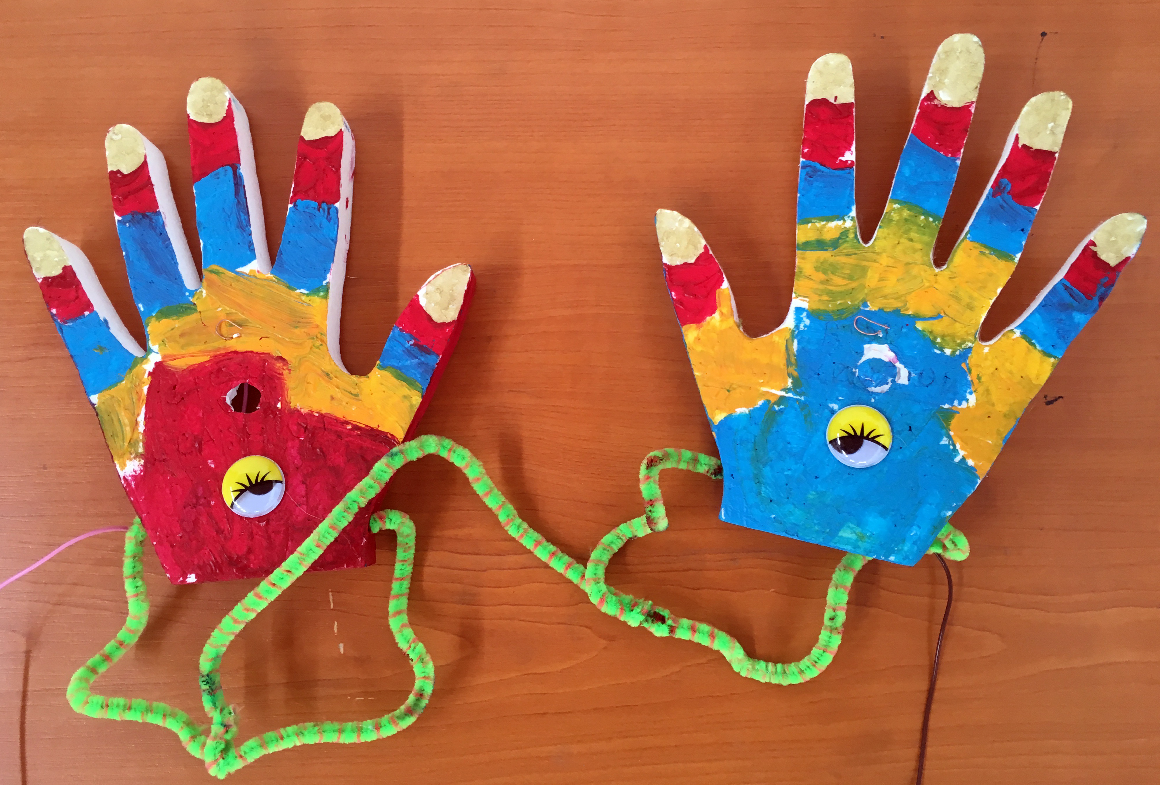 Next, the children started designing and embellishing a pair of pre-cut styrofoam hands provided by a donor. These hands were then wired to Makey Makeys to be 'played' at the final exhibition using Soundplant.