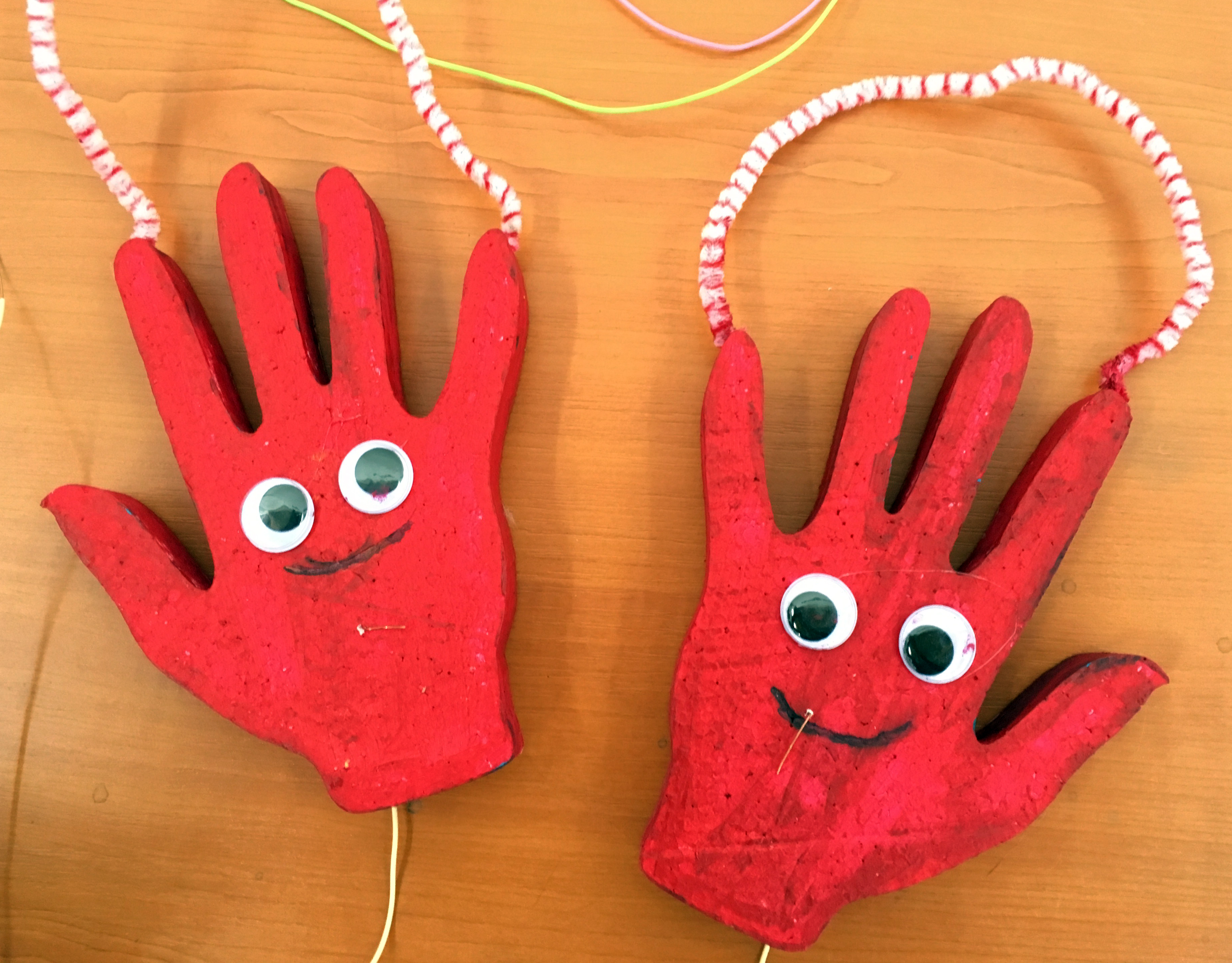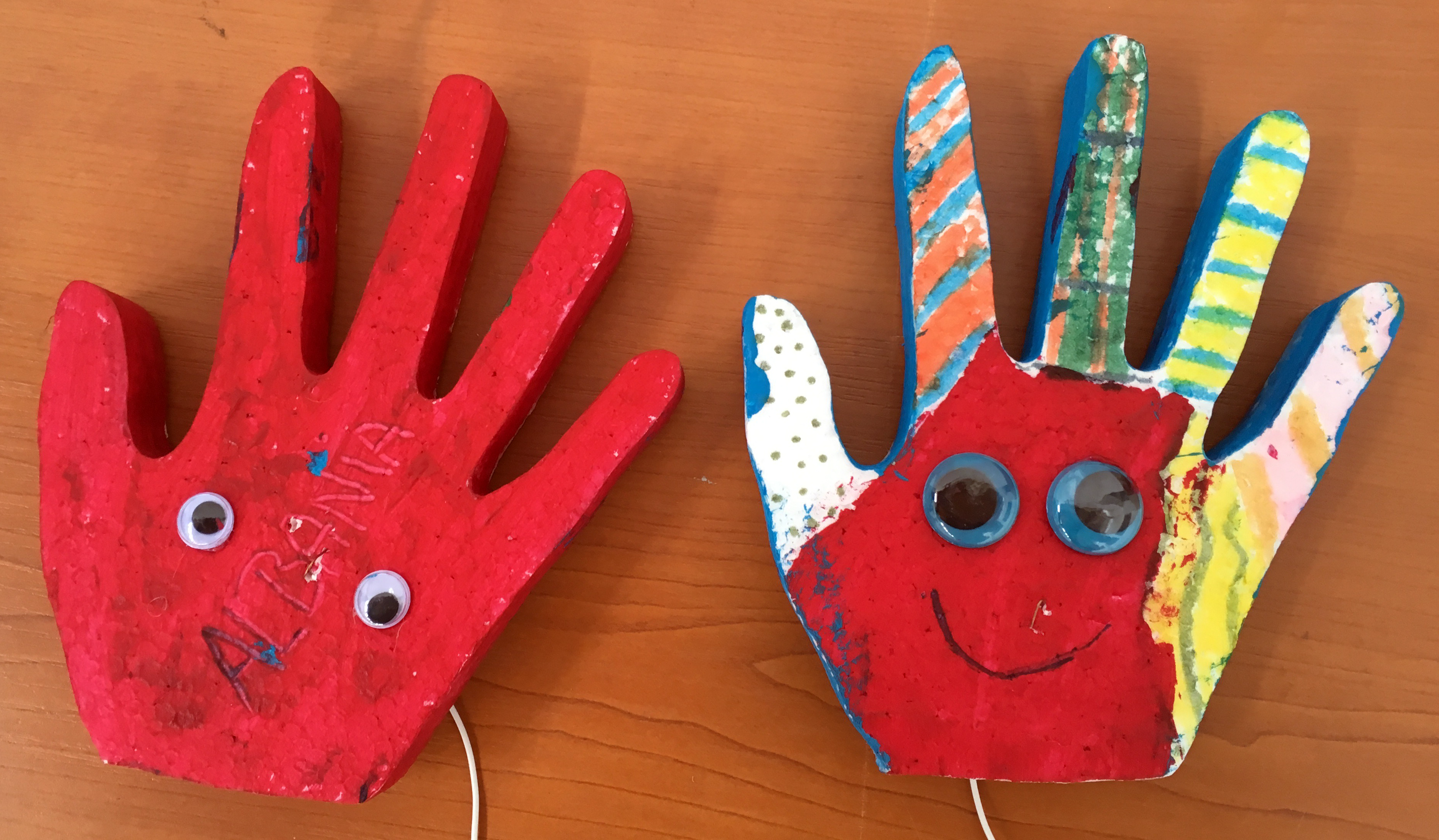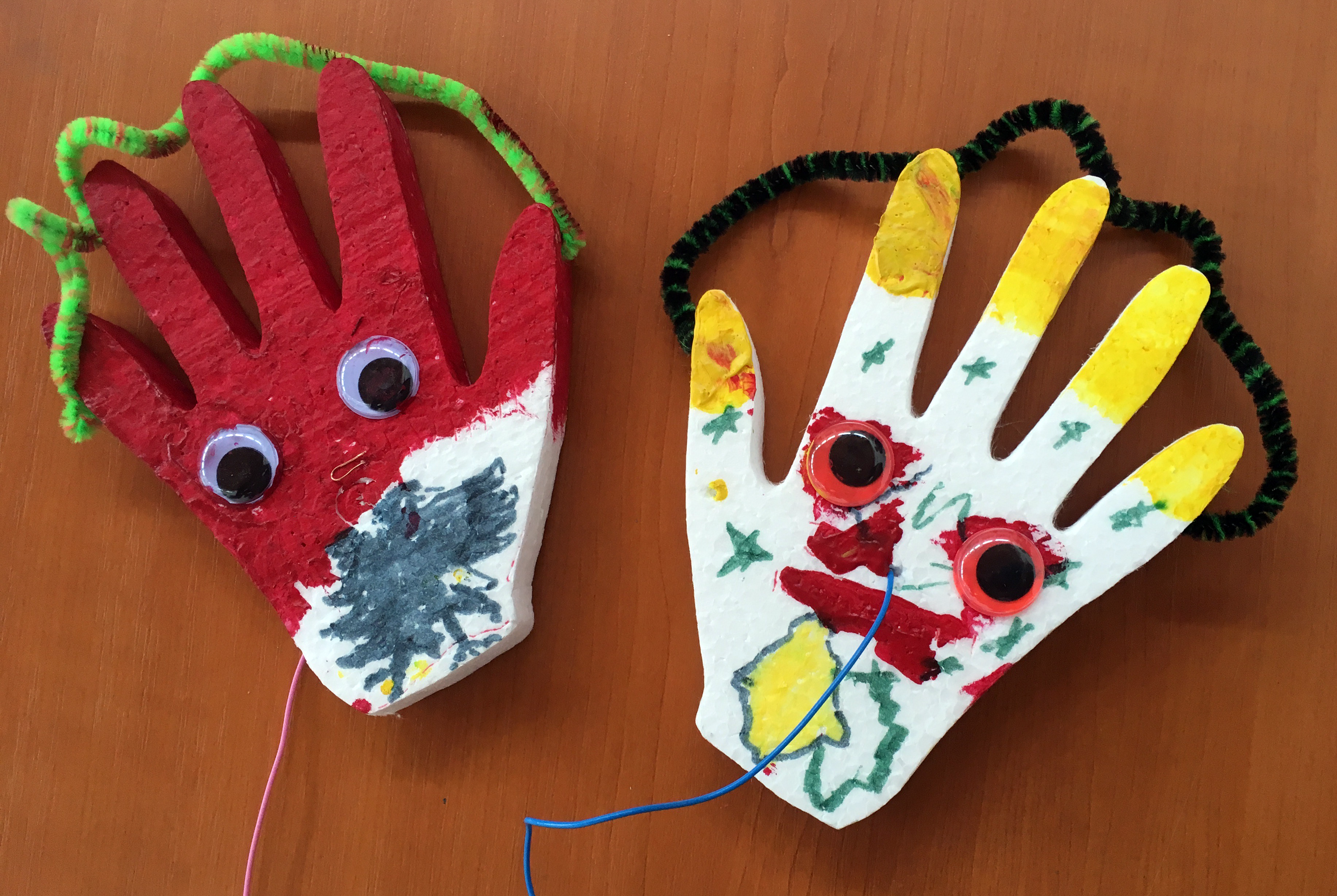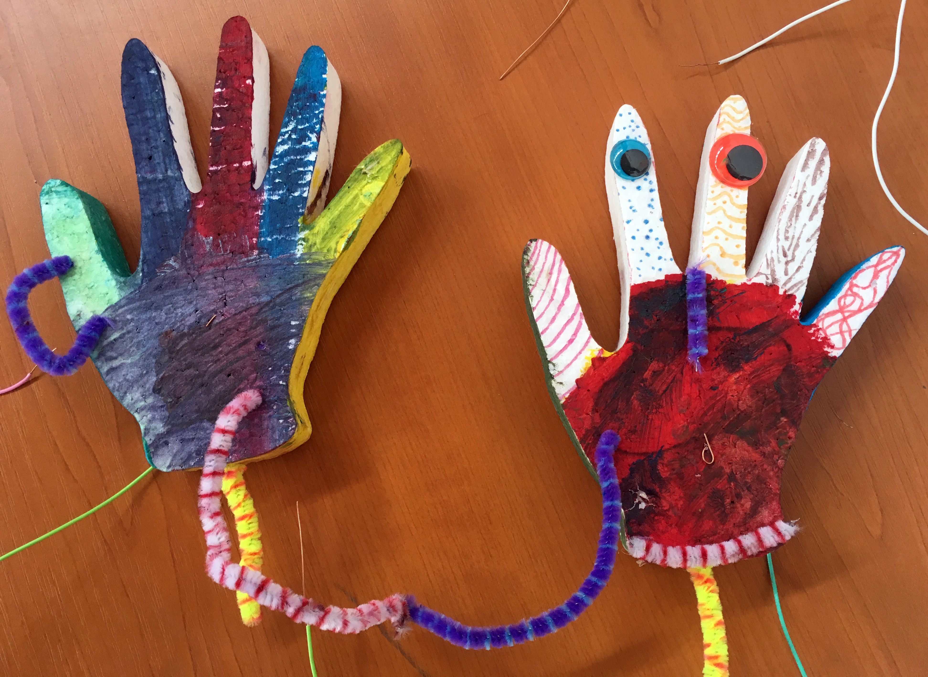 Next, the children started designing and embellishing a pair of pre-cut styrofoam hands provided by a donor. These hands were then wired to Makey Makeys to be 'played' at the final exhibition using Soundplant.