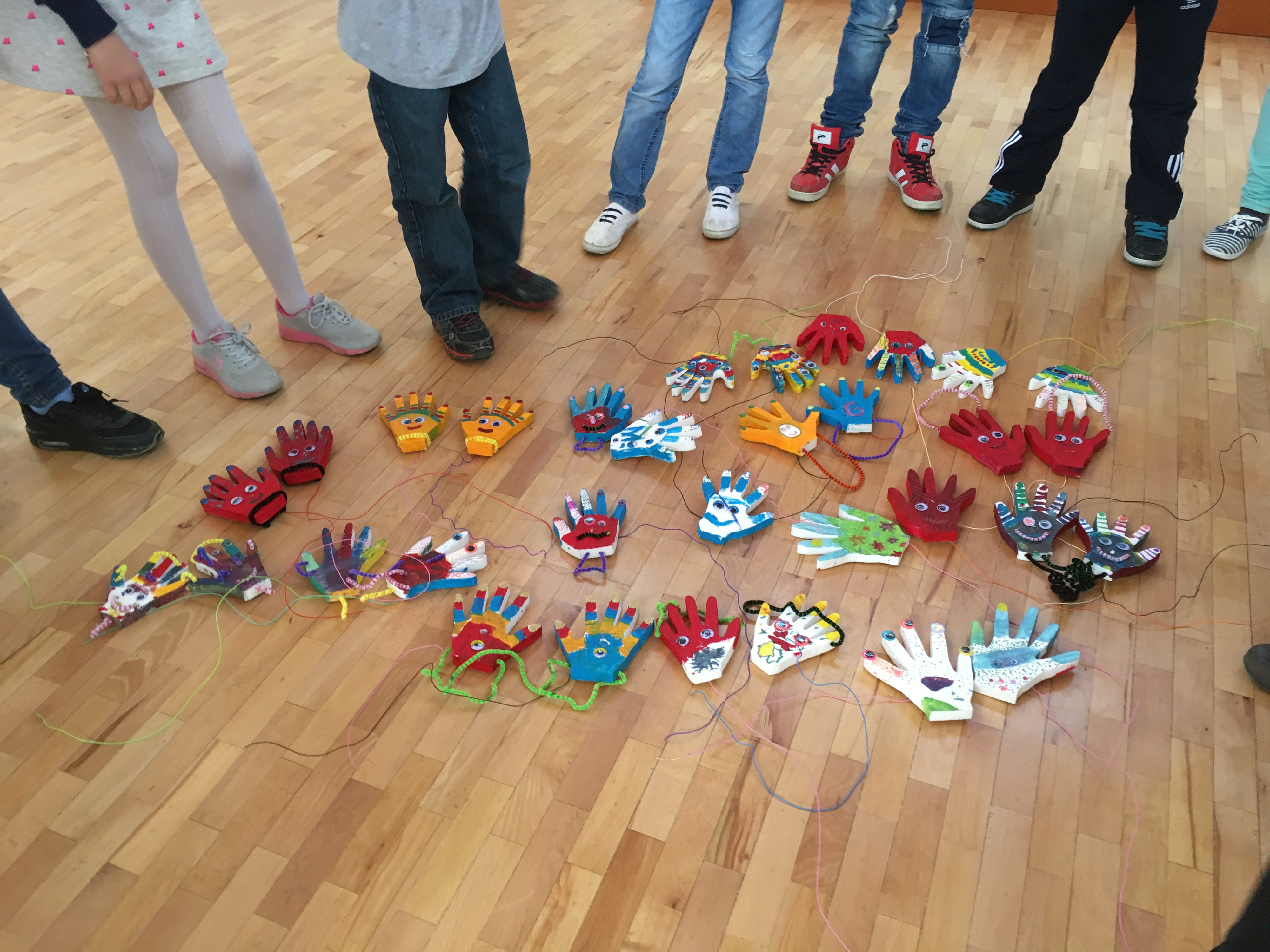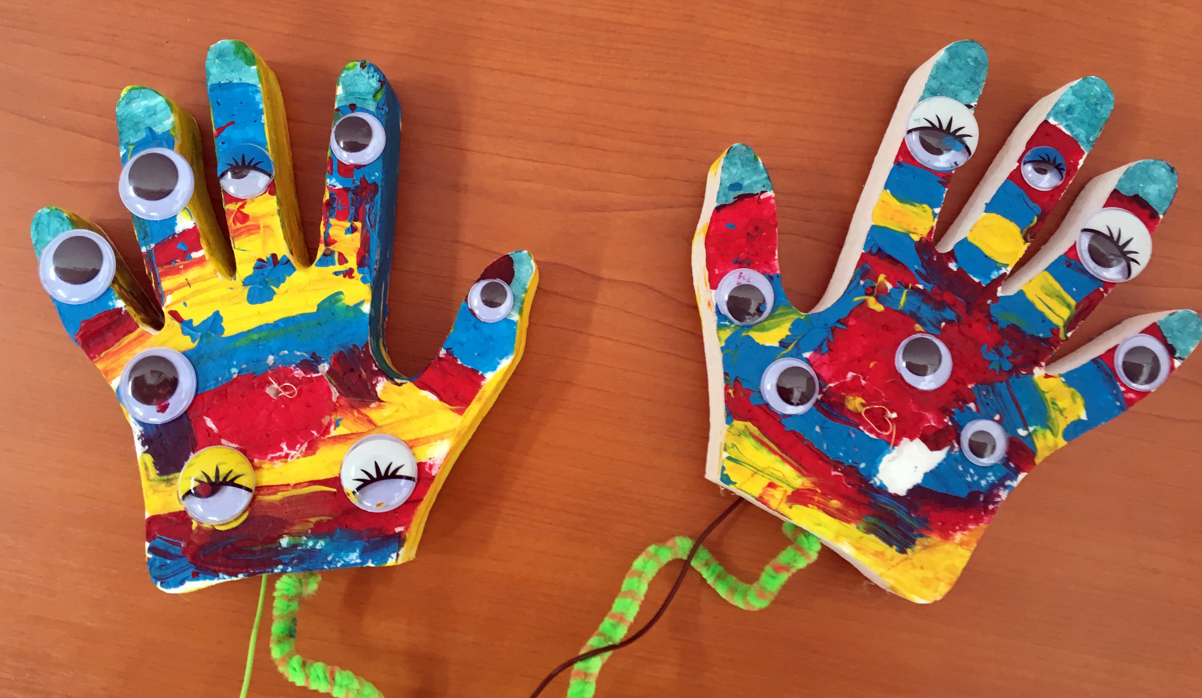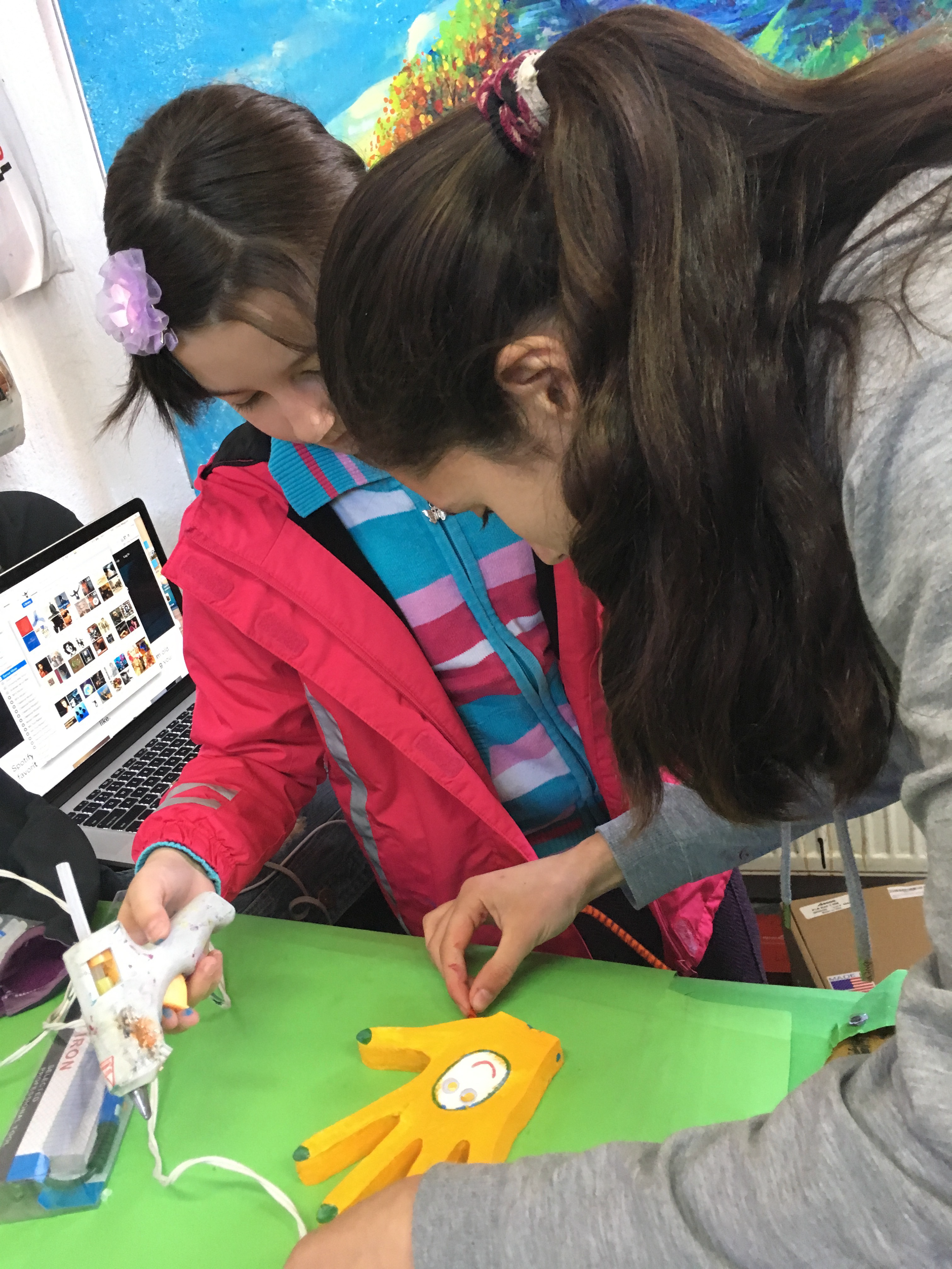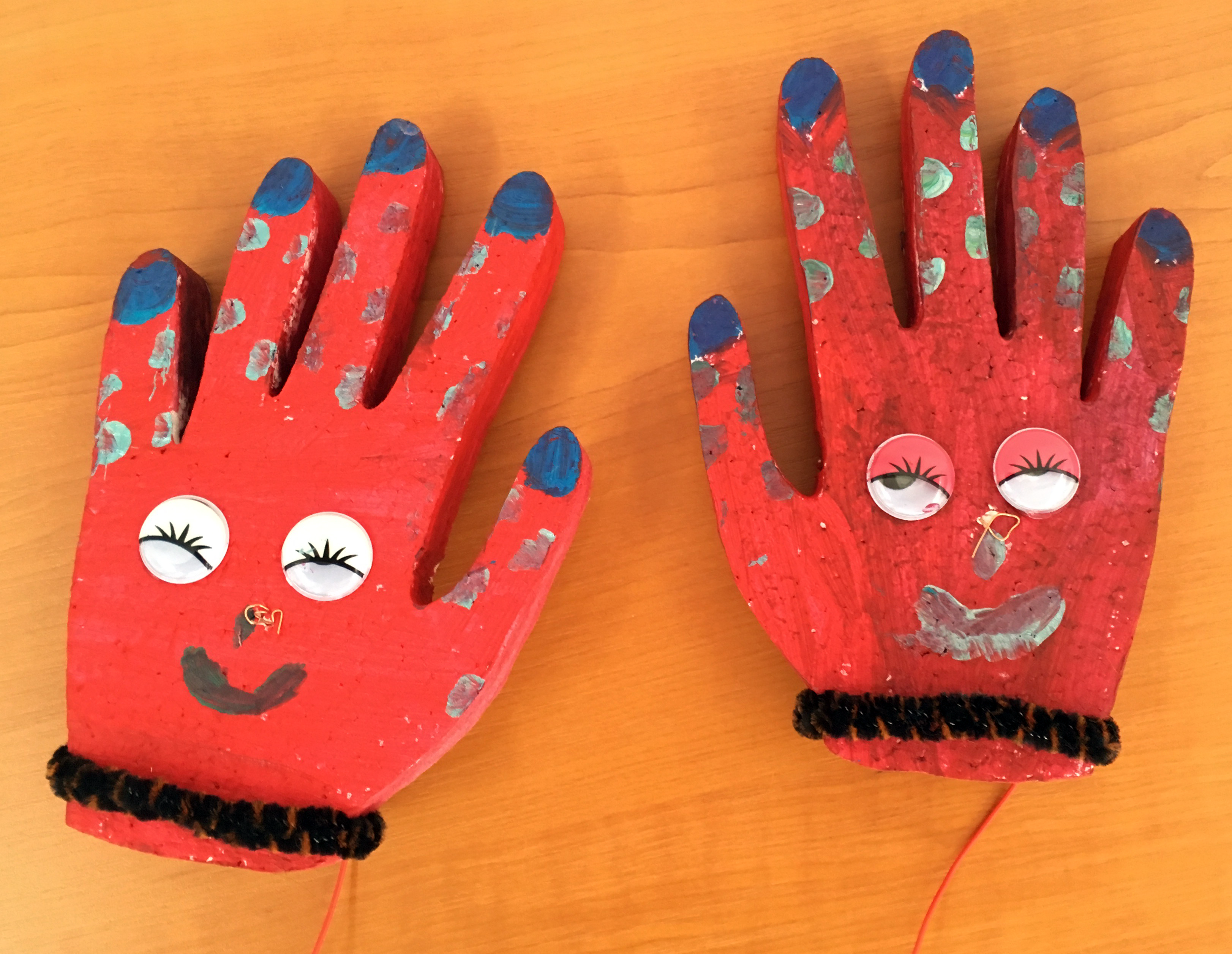 Next, the children started designing and embellishing a pair of pre-cut styrofoam hands provided by a donor. These hands were then wired to Makey Makeys to be 'played' at the final exhibition using Soundplant.