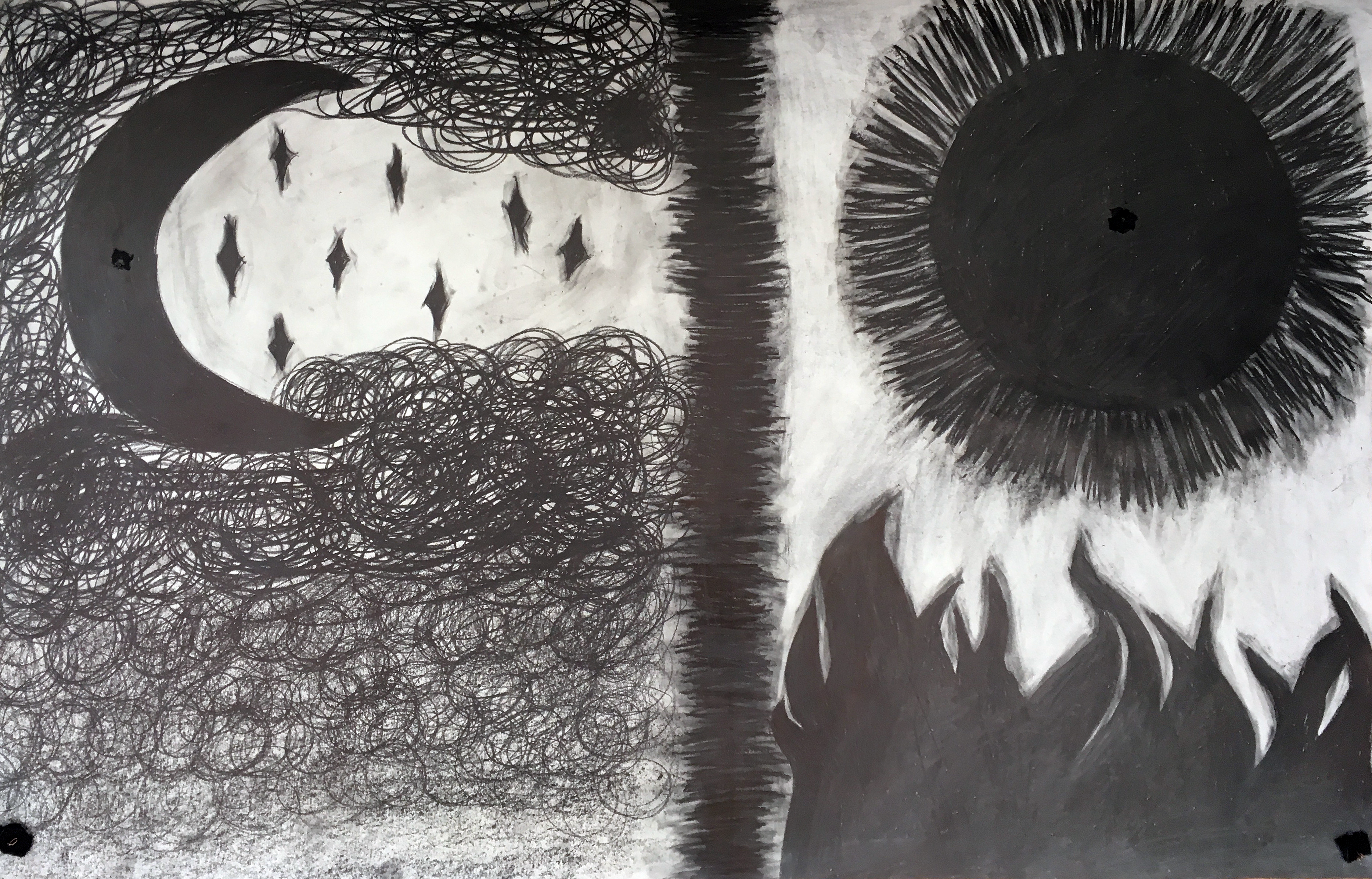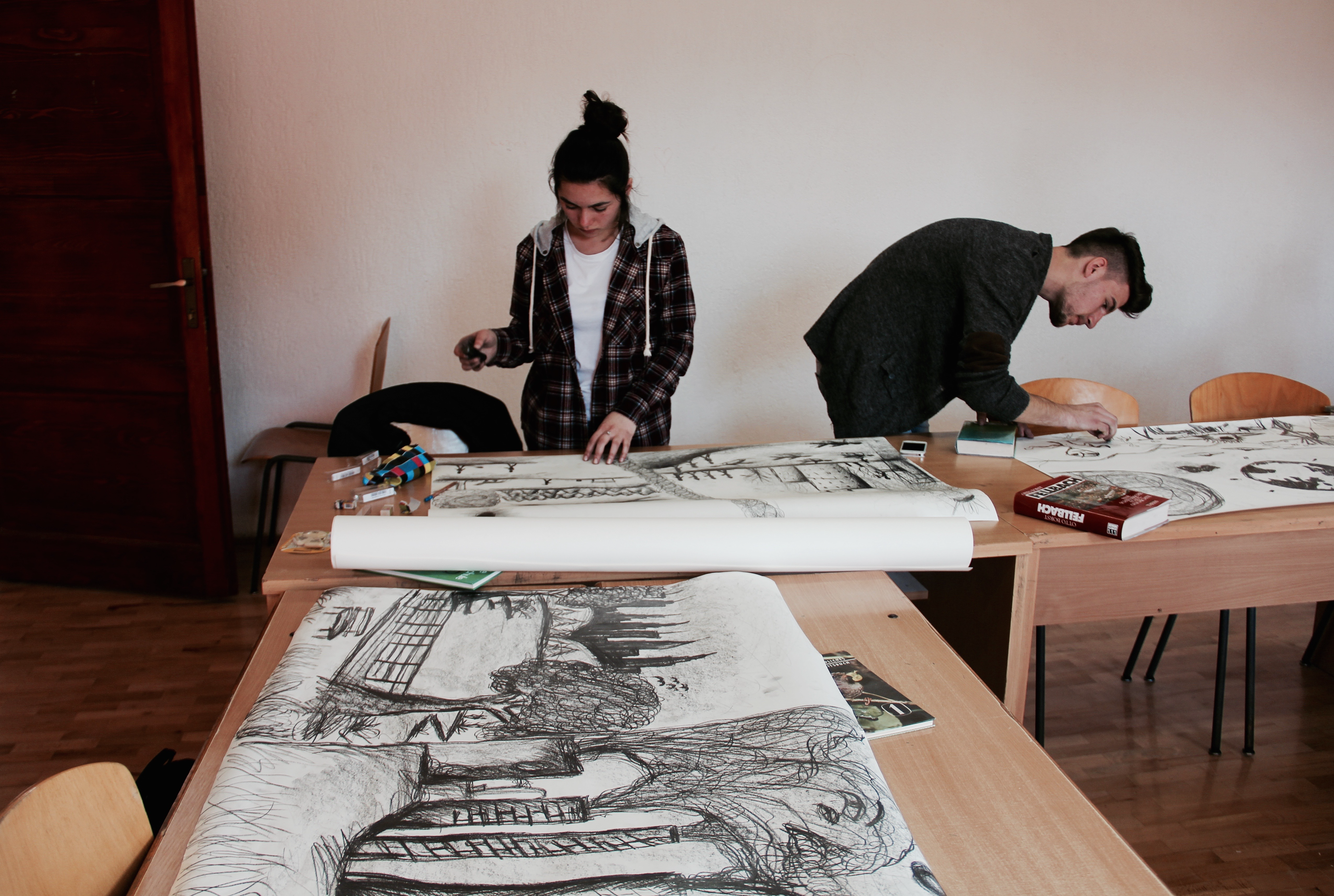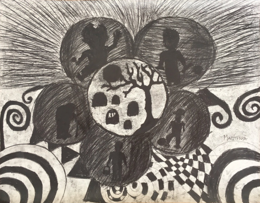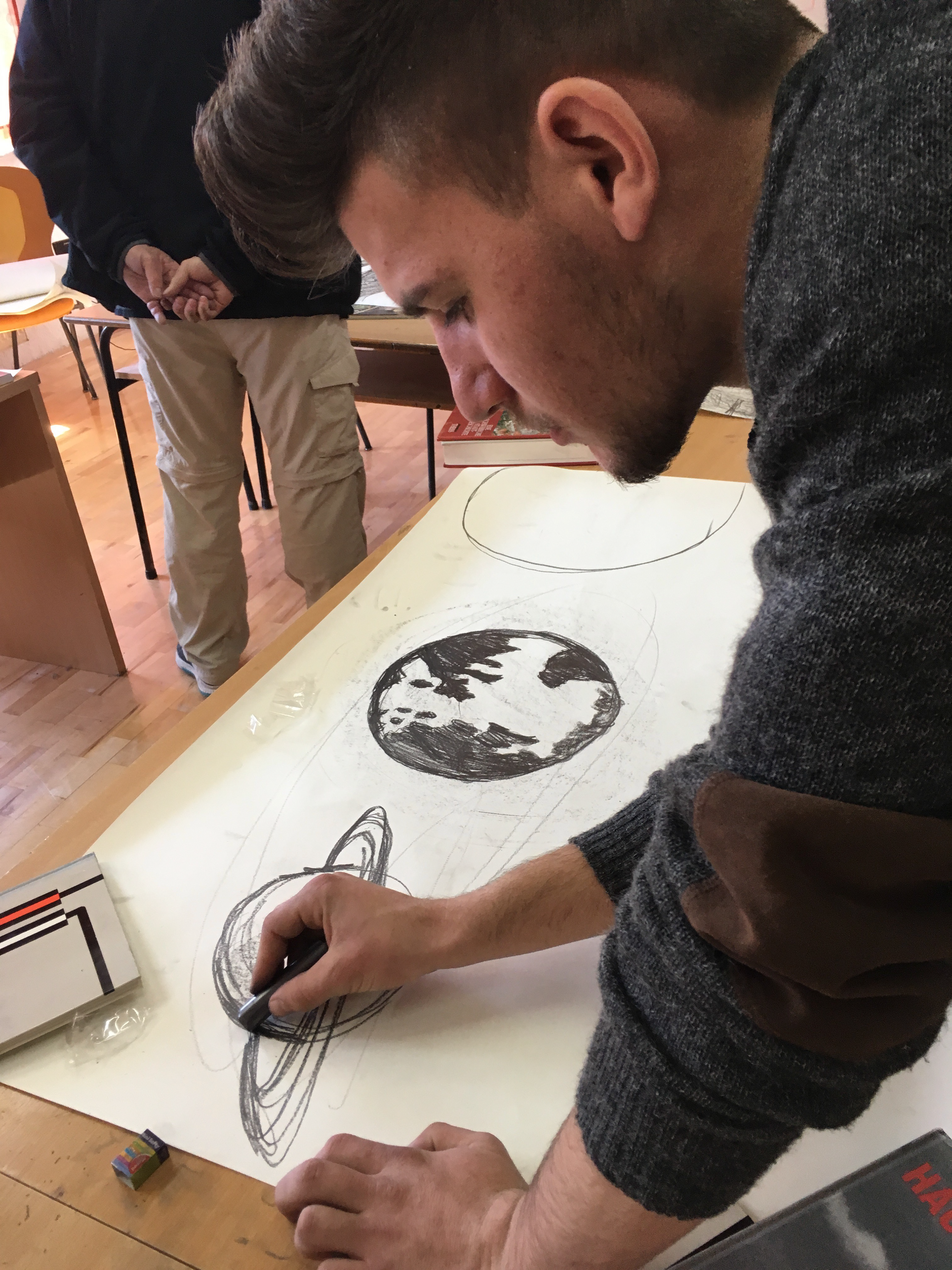Once the students talked through and sketched out initial ideas, they began working on large-scale graphite drawings, made interactive with Bare Conductive Touchboards.