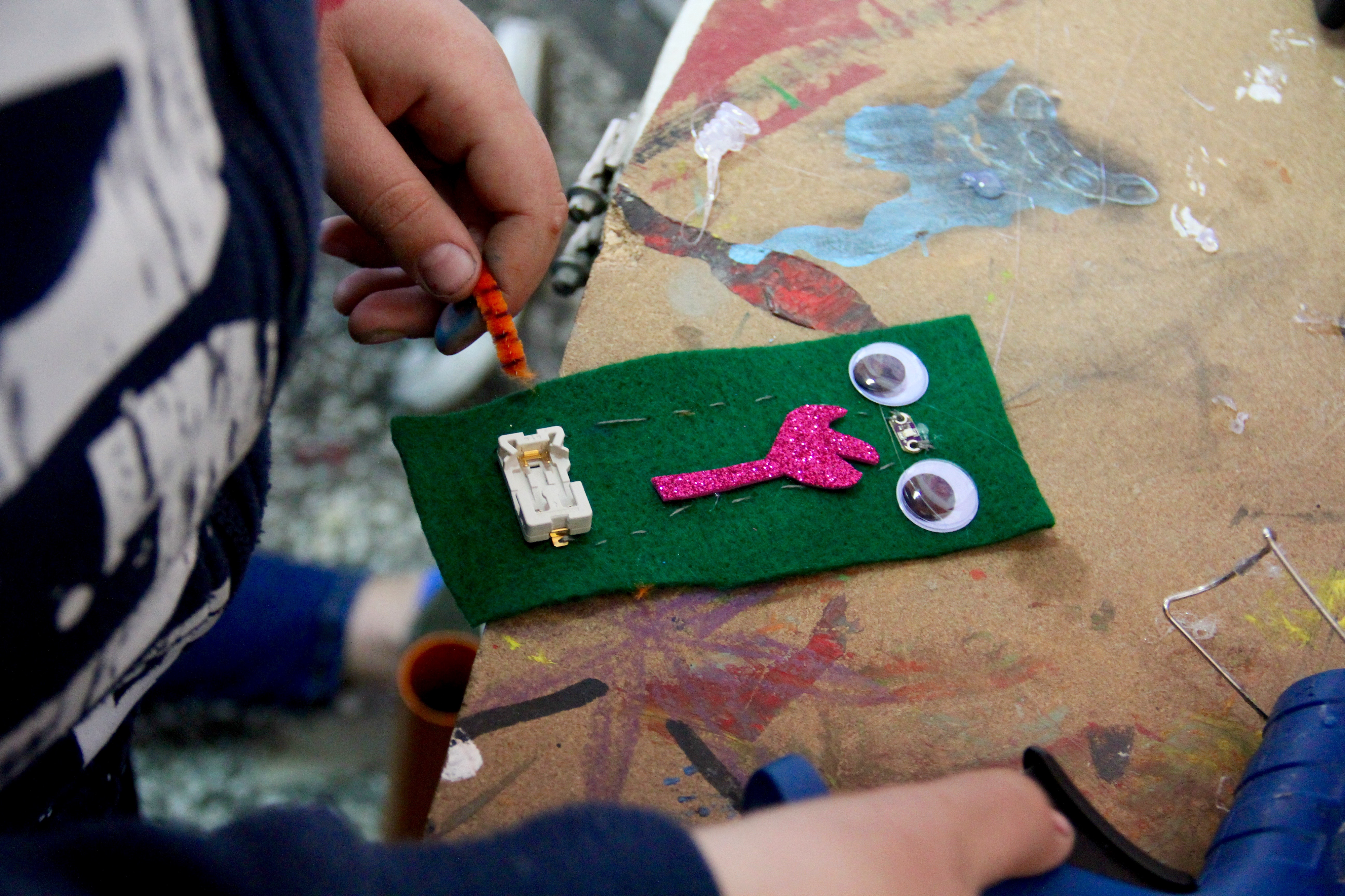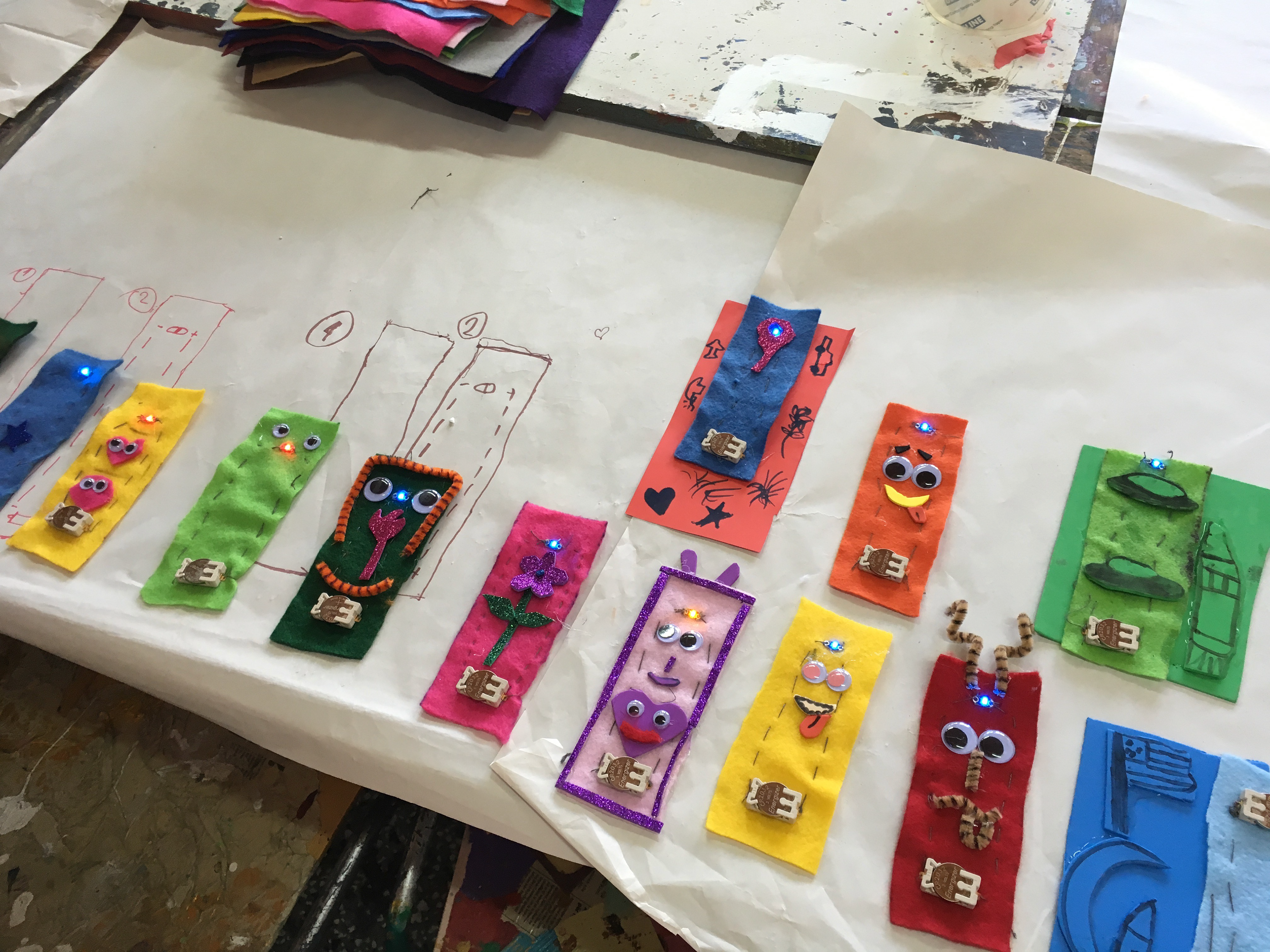 The e-textiles project was based on a lesson from the book, Sew Electric, a joint project between MIT researchers and the National Center for Women and Information Technology (NCWIT) by Leah Buechley, Kanjun Qiu, Sonja de Boer, and Tayo Falase. The children worked with felt, LilyTiny LED lights, sewable battery holders and a range of materials to embellish their own bookmark book light.