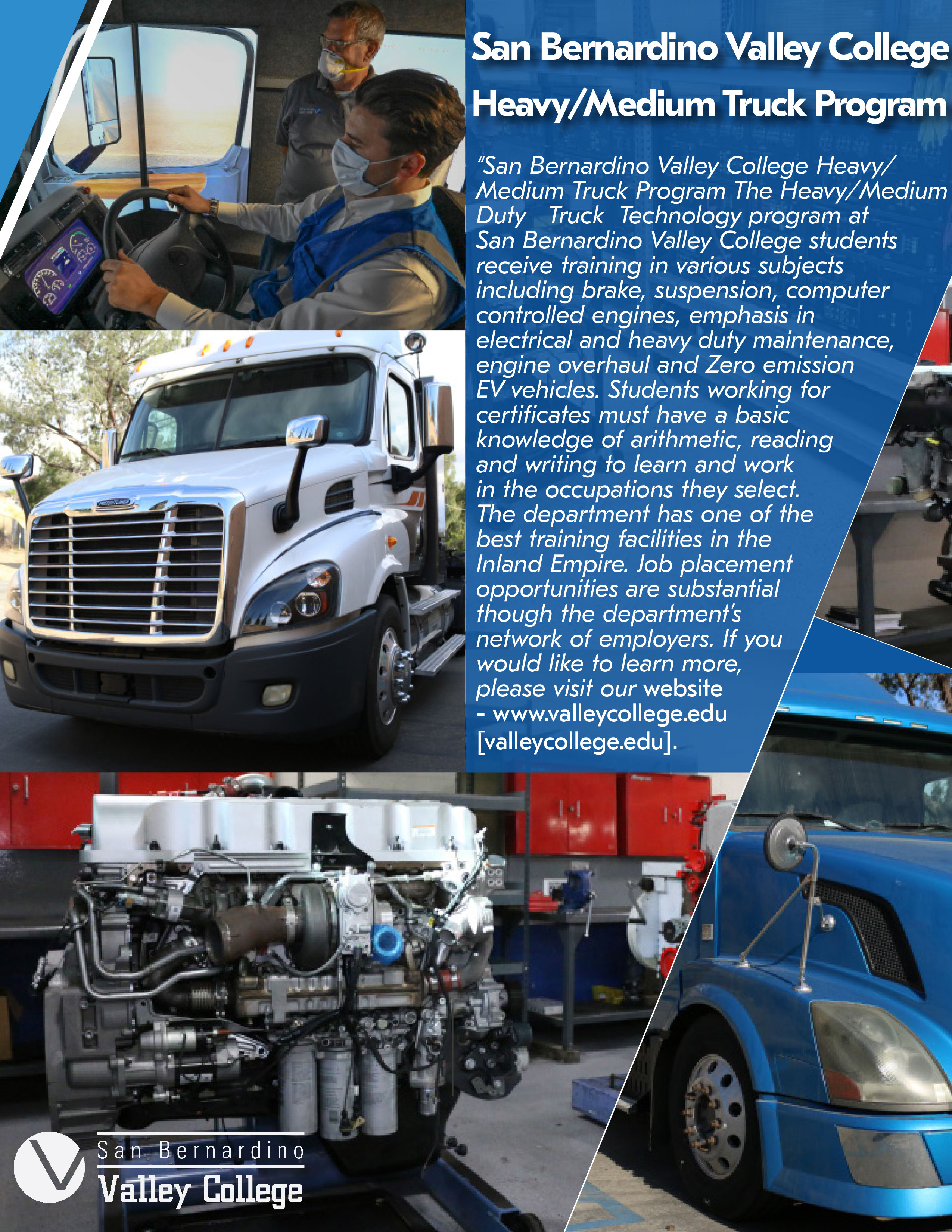 The Heavy/Medium Duty Truck Technology program at San Bernardino Valley College students receive training in various subjects including brake, suspension, computer controlled engines, emphasis in electrical and heavy duty maintenance, engine overhaul and Zero emission EV vehicles. Students working for certificates must have a basic knowledge of arithmetic, reading and writing to learn and work in the occupations they select. The department has one of the best training facilities in the Inland Empire. Job placement opportunities are substantial though the department's network of employers. If you would like to learn more, please visit our website: www.valleycollege.edu.